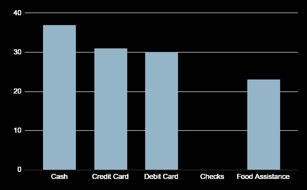 ■ Stores were most likely to accept cash and credit and debit cards; 62.2% accepted food assistance.