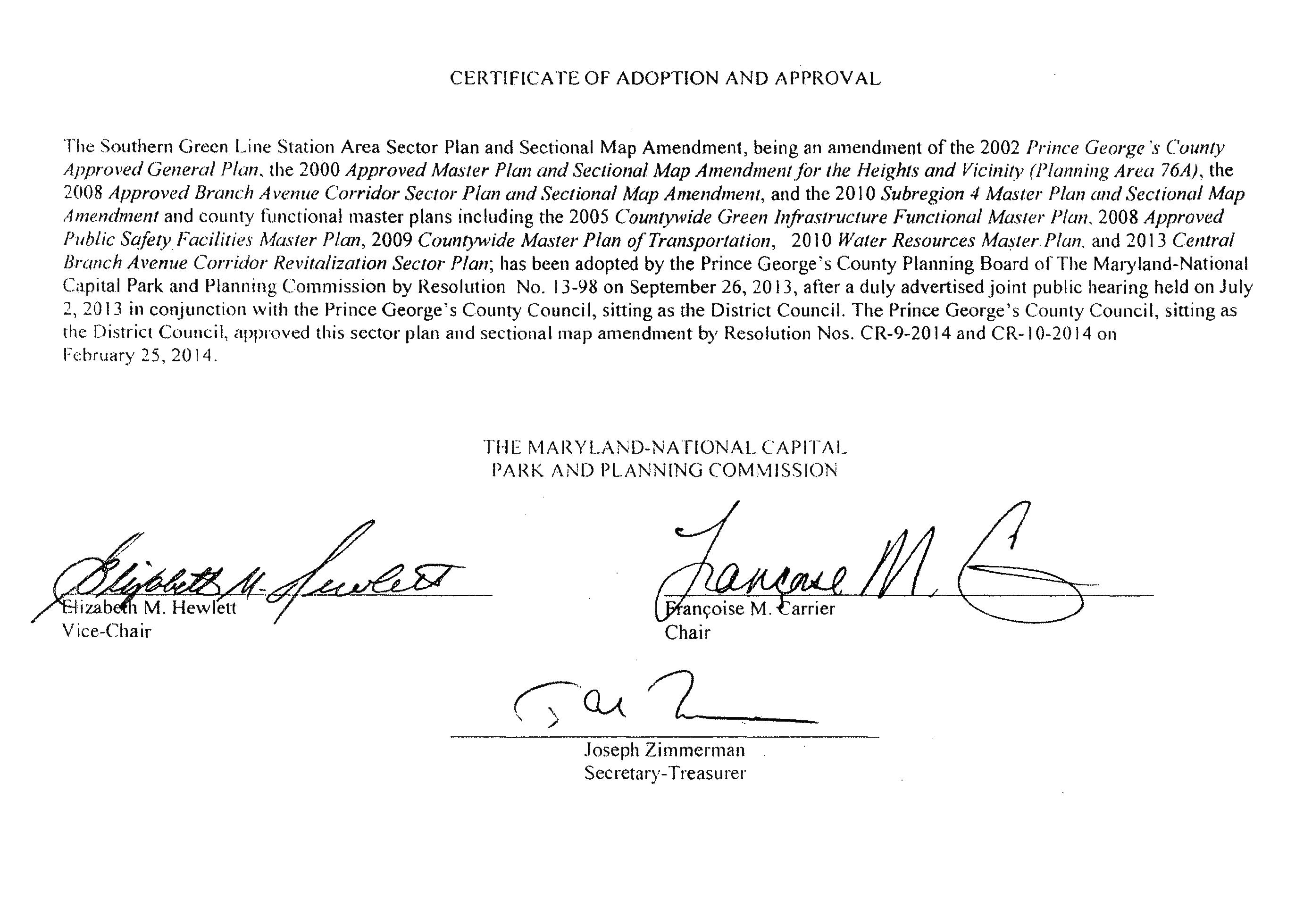 On July 2, 2013, the Prince George’s County Planning Board and the District Council held a joint public hearing to solicit comments on the preliminary plan. The Planning Board adopted the plan on September 26, 2013, with modifications pursuant to PGCPB Resolution No. 13-98. The District Council held a work session and proposed amendments to the adopted plan. On January 14, 2014, a second joint public hearing was held on the proposed amendments. The District Council approved the sector plan per CR-9-2014 on February 25, 2014. A concurrent Sectional Map Amendment (SMA), including the reclassification of properties to facilitate plan implementation, was endorsed by the Planning Board through PGCPB No. 13-98 and approved by the District Council per CR-102014 on February 25, 2014. This Sectional Map Amendment was superseded in its entirety by the 2021 Approved Countywide Map Amendment. This sector plan was amended through CR-1032023 on October 24, 2023.