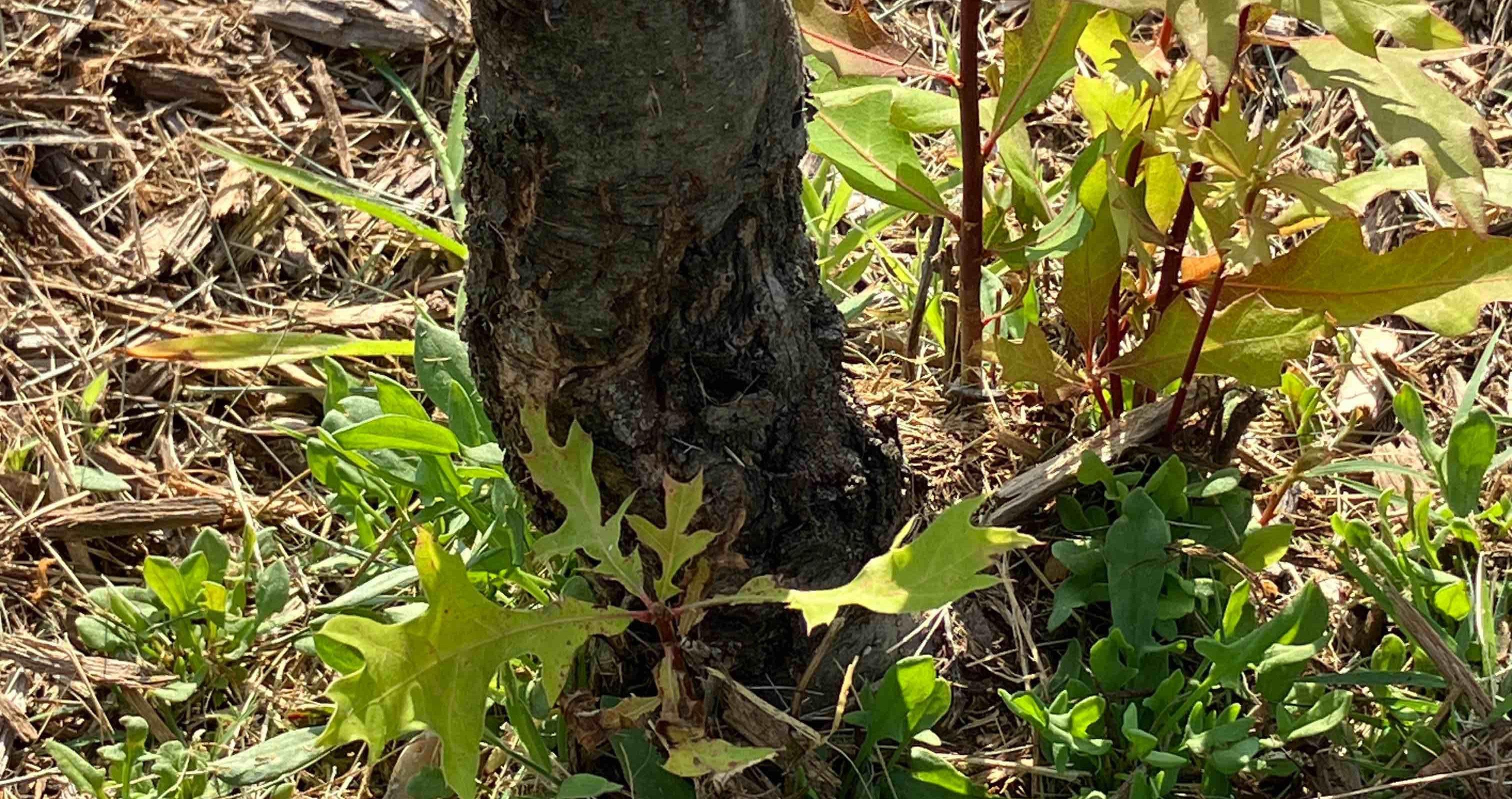 Mulched areas surrounding the base of a planting. This reduces the likelihood of mower/mechanical injury, reduces competition from turf, and maintains a more stable root environment.