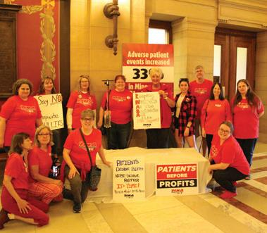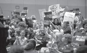Staffing for Patient Safety Act requiring minimum standards of nurse-to-patient staffing is introduced. After succeeding in several committees, it still fails to reach a floor vote. Nurses lend their voices to rally against attempts to advance legislation attacking workers’ rights to form and maintain a union, commonly known as Right-to-Work measures. Member actions in Albert Lea, Marshall and Bagley demonstrate determined to fight for contract rights and are willing to be visible. In an unprecedented and telling move, Twin Cities employers approach Twin Cities nurses in December offering to negotiate a wage-only, three-year contract, promising to keep all other aspects of the contract intact. Nurses agree and ratify a 4.5% wage increase.