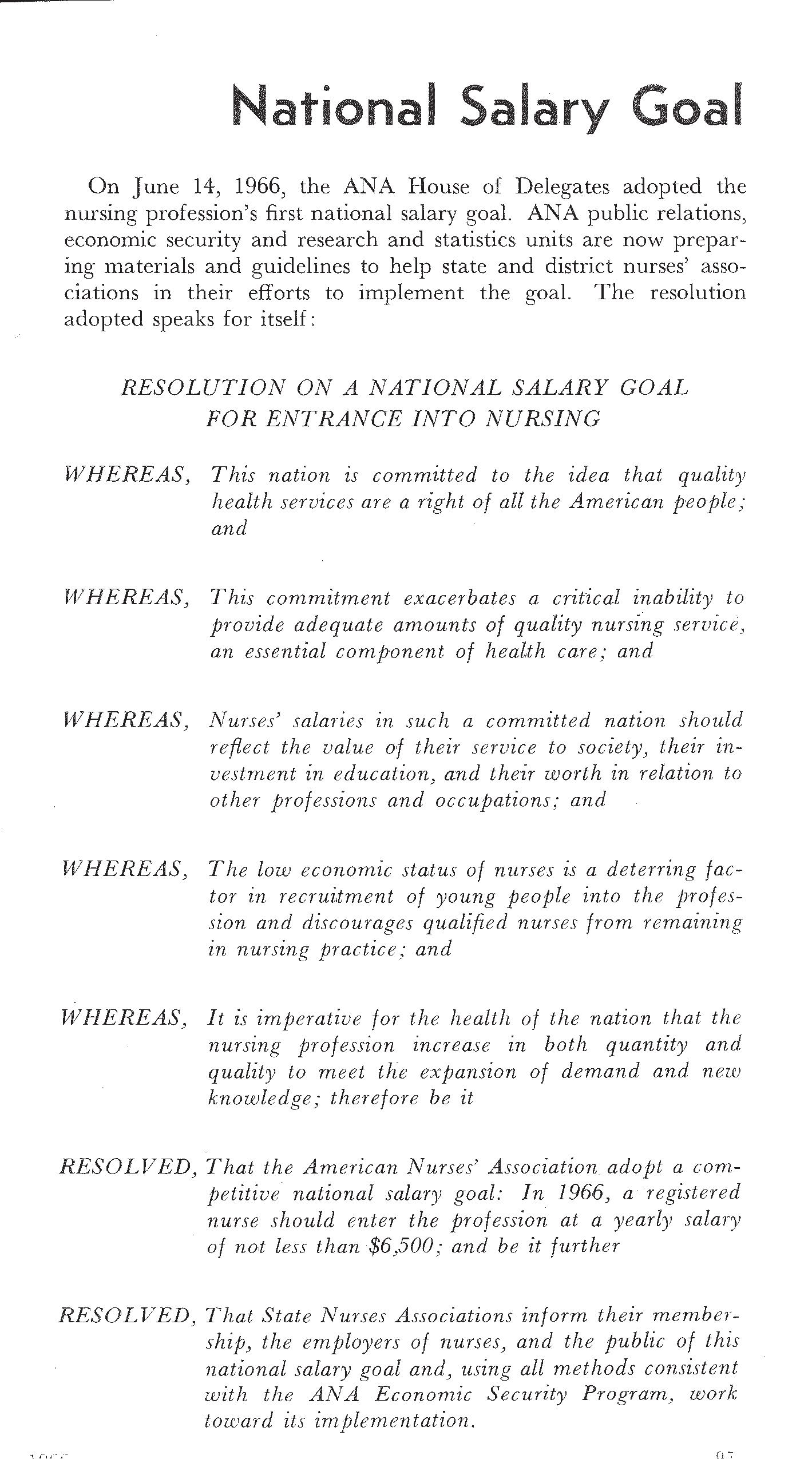 1966 ANA resolves to establish a National Salary Goal of $6,500 per year (an increase from $4,932), stating “nurses’ salaries in such a committed nation should reflect the value of their service to society;” MNA members step up to the call and, led by Audrey Logsdon, stage a mass resignation in December; employers agree to new salary terms.