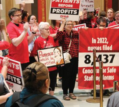 2023 MNA’s staffing bill, the Keeping Nurses at the Bedside Act (KNABA), moved through all necessary committees in both the House and Senate but was ultimately cut from the final bill after very public pressure campaign by the Mayo Clinic and other hospitals. MNA also helped develop and successfully pass a new law to better regulate hospital and healthcare mergers, creating new public interest requirements to protect healthcare workers, patients, and communities across the state to safeguard healthcare access from the consequences of profit-driven transactions. MNA further worked alongside other labor unions and advocates to advance additional pro-worker legislation that was ultimately successful, including Minnesota’s Paid Family and Medical Leave (PFML) and Earned Safe and Sick Time (ESST) laws and new protections for public sector workers.