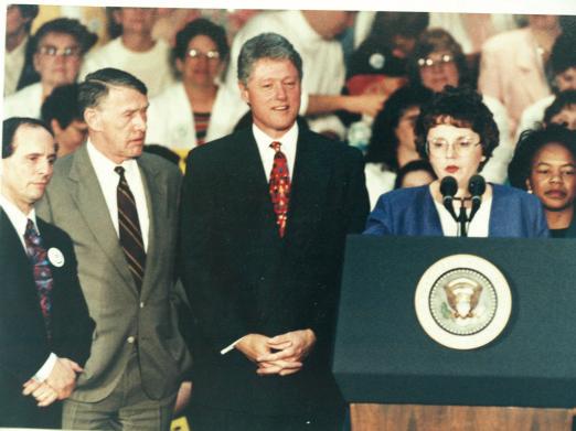 1993 President Clinton chooses MNA to kick off his campaign for Universal Healthcare Coverage. The terms workplace “restructuring,” “redesign,” “reorganization,” creep into the language and operation of many Minnesota hospitals; nationally, significant numbers of nurses find themselves “downsized or “rightsized” out of a job; Minnesota’s nurses are largely spared via contract language; MNA House of Delegates unanimously adopts resolution to “continue representing the interests of Registered Nurses in the development and implementation of a national transition plan for Health Care Reform that prevents the erosion of quality patient care through inappropriate reductions in Registered Nurse staff.”
