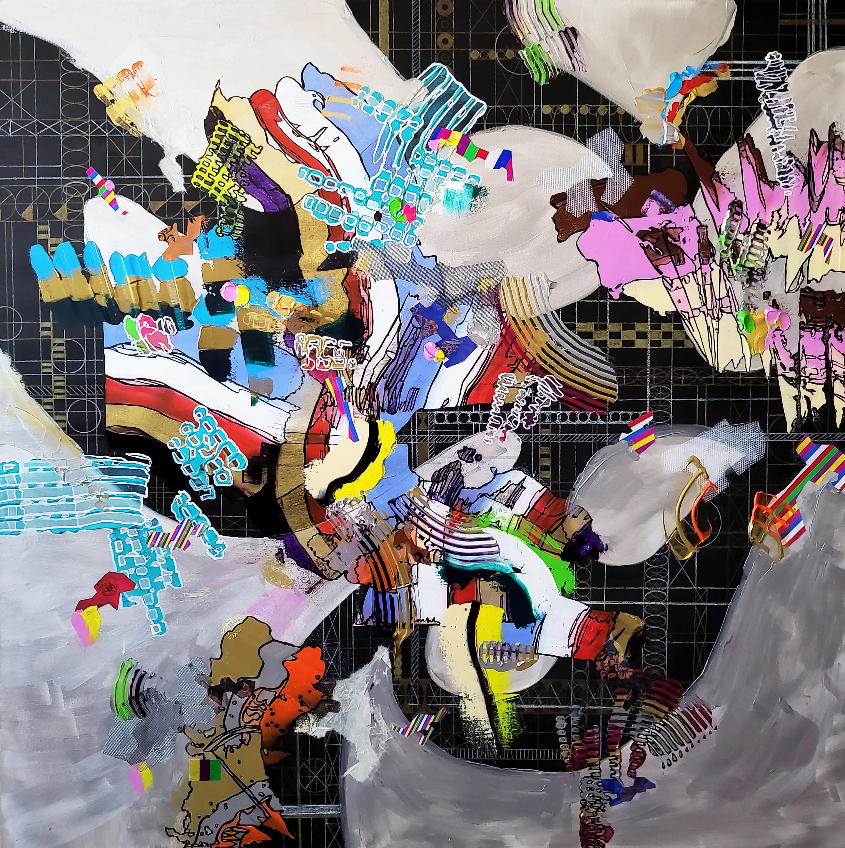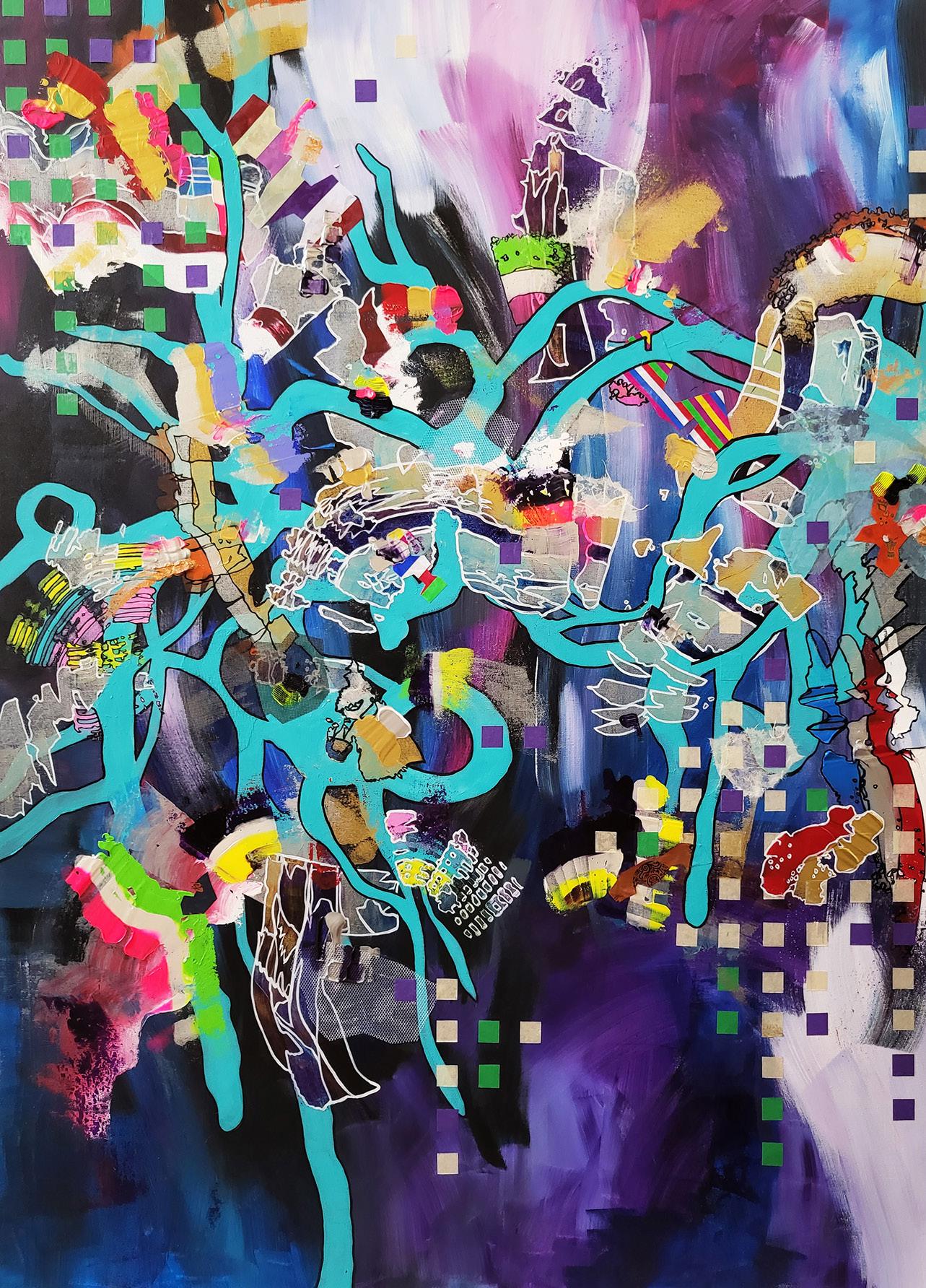 concontemporaneity. The patterns selected by the Dallas-based artist in Mindscapes unfurl on the canvases, repeating and interrupting, merging to create intricate networks. They embody a distinctive aspect of present-day reality: the interconnection between nature and technology.