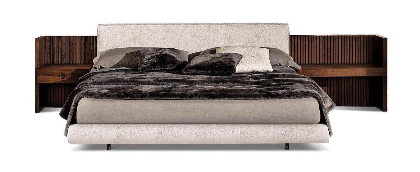 // minotti brasilia bed, airy and elevated from the ground, the sports a large wooden equipped headboard that embraces the padded part of the bed available. sminkinc