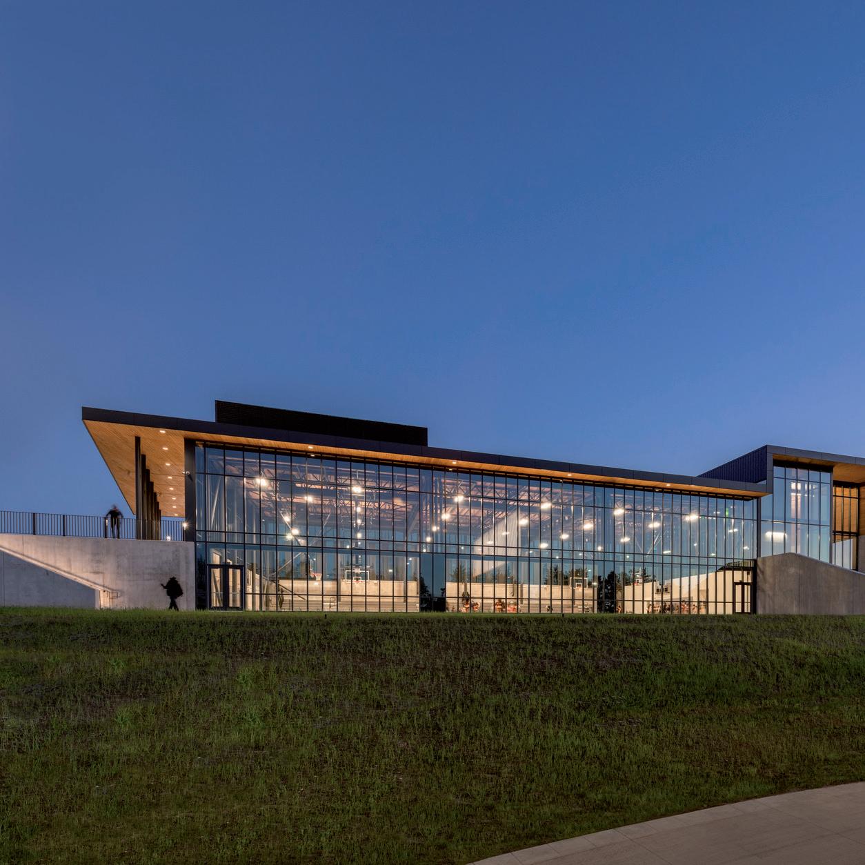 The center is a far cry in every way from the original building. The original was built in 1973, and it was located in the valley below the hills in a flood plain. Stelmarski remarked “It was pretty opaque. Not what you’d want in the building.” The largely concrete and windowless squat, bunker-like structure was built of concrete and offered 25,000 square feet of space. The new facility is practically its exact opposite, and not just because of the care, thought, and expertise applied by Perkins&Will in its conception. The community was very much involved in