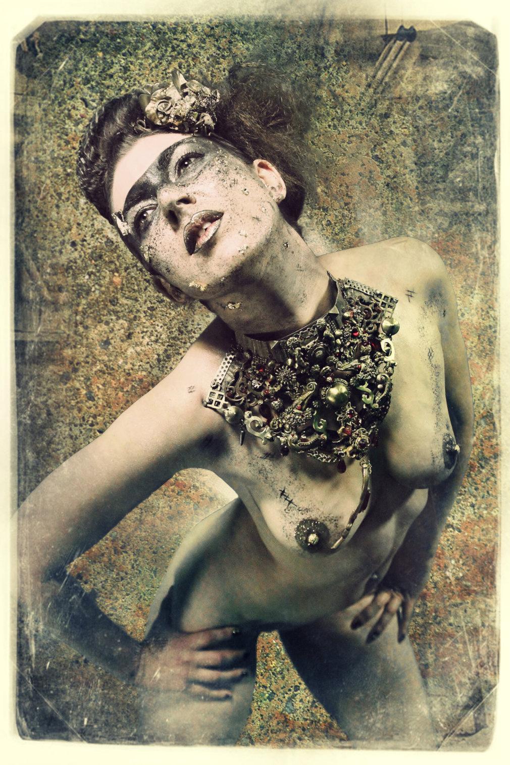 Please briefly describe your photography style for our readers. My photographic style is characterized by cinematic sets built entirely in my studio. My works blend the real and the unreal, creating scenes filled with mystery and melancholy. I often use chiaroscuro to add narrative and visual depth. Feminine nudity is often explored, symbolizing vulnerability, strength, intrinsic beauty, and divinity. My photographs are an eclectic assembly where each element, even bits and pieces, finds its place to give life to the imaginary worlds of my mind.