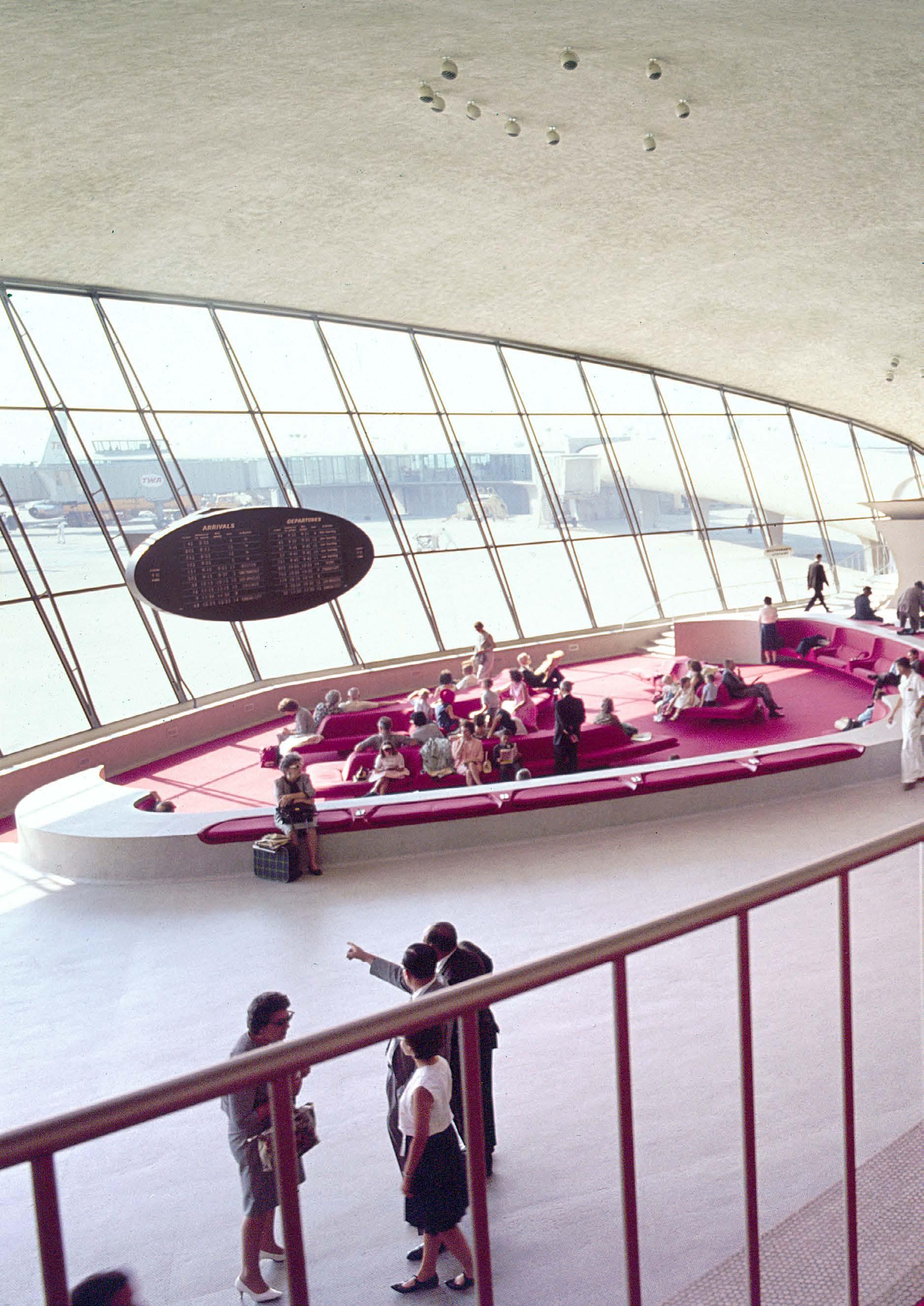 Flight Center in the 1960s included this sleek seating area upholstered in TWA’s signature shade of vivid red, accompanied by Saarinen’s Tulip tables and stools. See more on page 78.