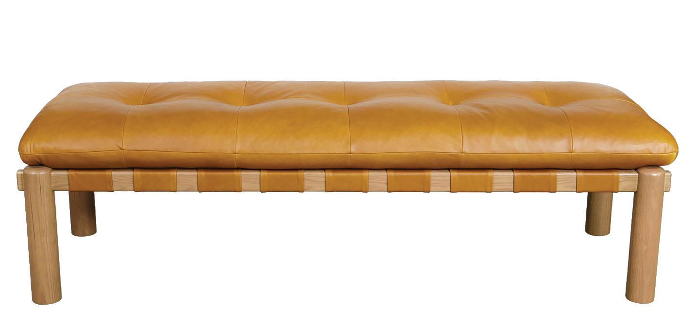 1. Nadine Sideboard in Deep Burgundy 2. Mari Side Table 3. Carol Dining Chair in Deep Brown Leather 4. Costello Bench in Tan
