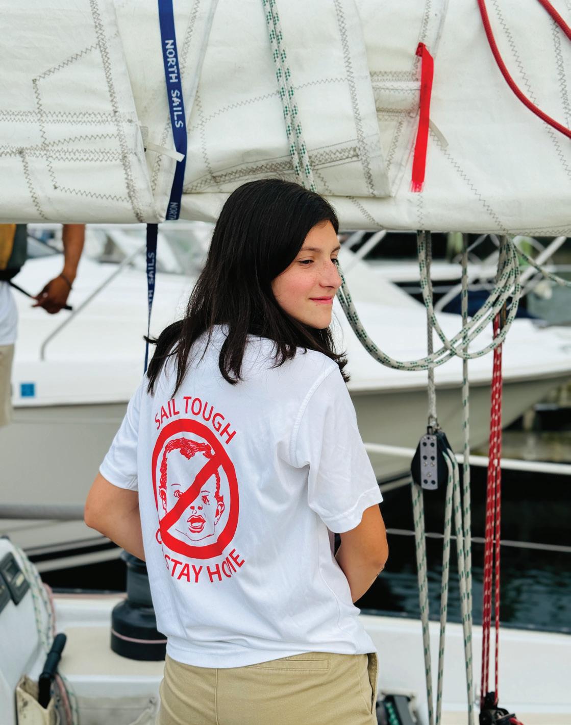 Top left: "Sail Tough or Stay Home"—the Celebration crew often races against adults and their race shirts are a cheeky nod to their youth. Above and below: .The crew takes turns at different positions but works together on jobs like keeping watch and readying the sails.