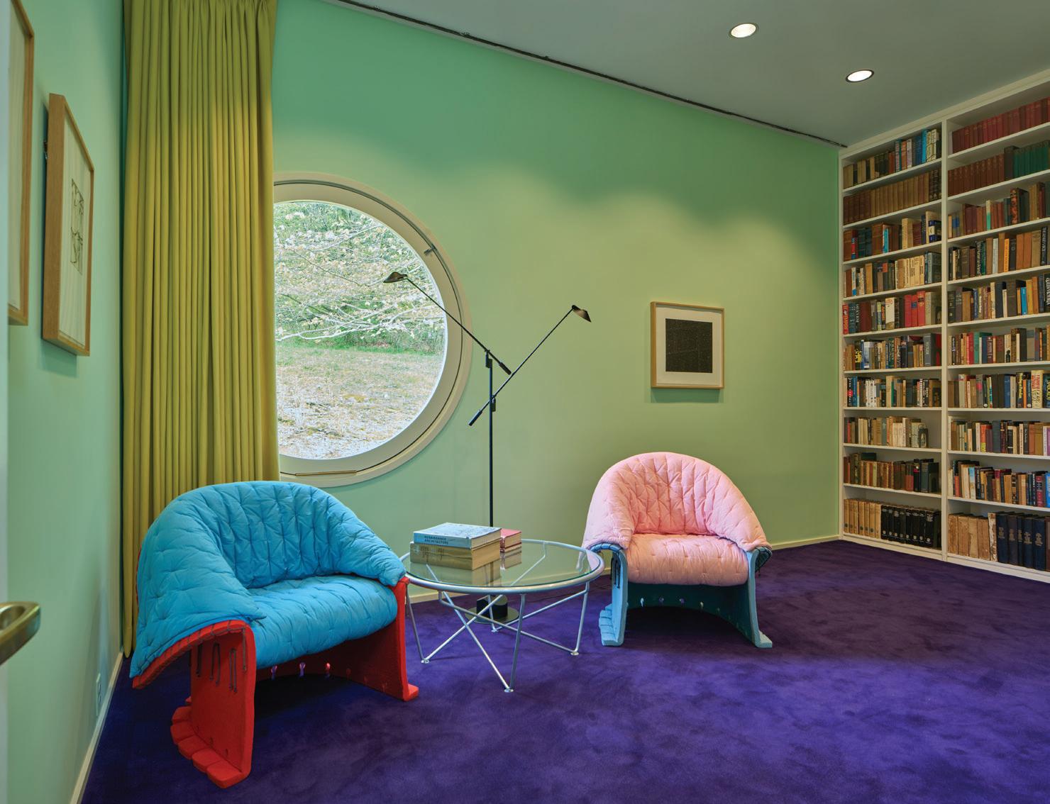 Clockwise from above: The colorful library in the Brick House features a purple carpet and two Feltri chairs by famous Italian architect and designer Gaetano Pesce. Skylights and three porthole windows bring in natural light, while the brick façade provides privacy in the bathroom and bedroom.