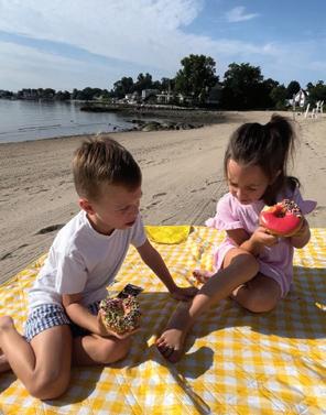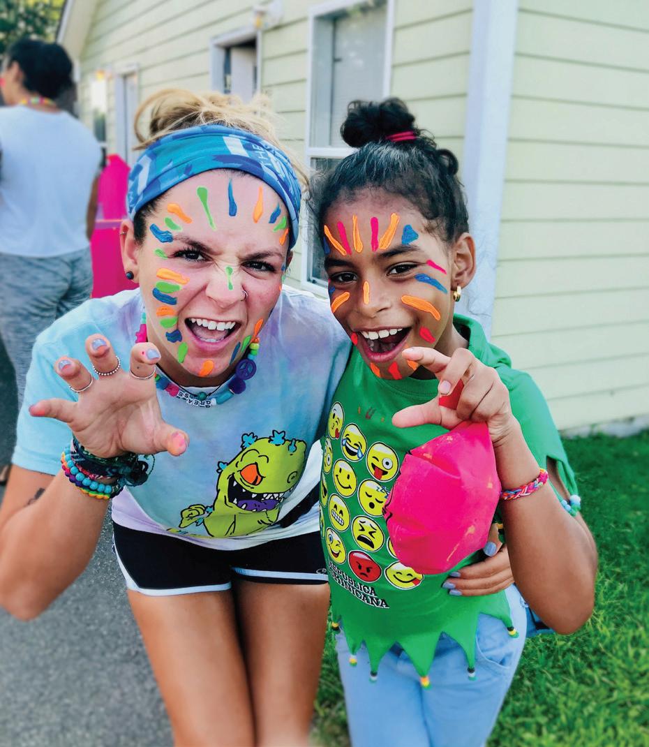 left: Counselor Grace and a camper share a colorful moment of joy during a themed activity. right: Siblings make a splash enjoying free swim at Camp AmeriKids. below: Kamren shares a smile and a sweet treat with his counselor, Carlos.