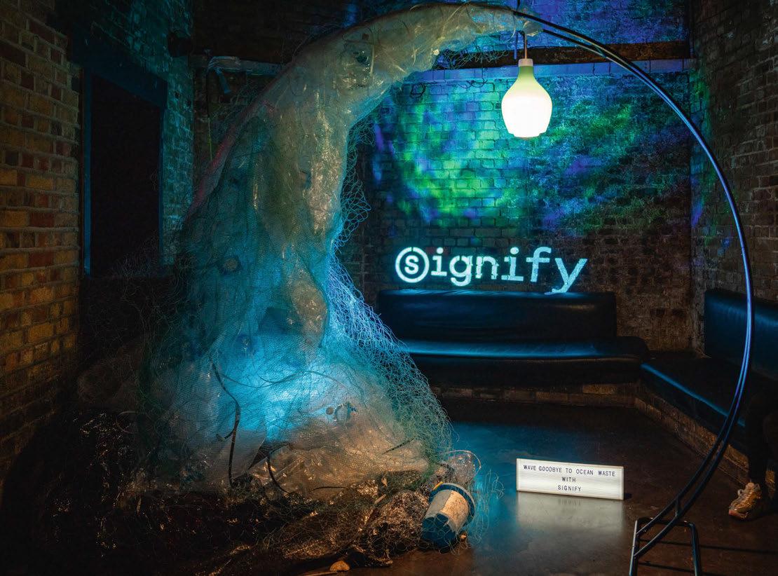 Signify’s decorative installation highlighted ocean waste and the need to preserve the beauty of coastal areas for the next generation. Repurposing plastics litter-picked from UK beaches, single-use plastic rubbish gathered by Signify employees, and discarded Cornish fishing nets, Signify created a giant wave, with a 3D-printed pendant from the Philips MyCreation Coastal Breeze Collection at its crest.