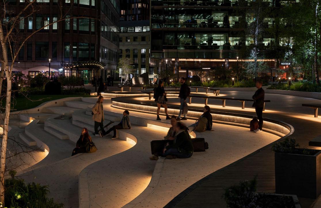 Exchange Square is a tranquil new park within the urban heart of London. As natural light fades, a balance of beautifully integrated light and retained darkness reveals the multi-level topography and curved landscape features while supporting intuitive wayfinding, ease of access, and promoting social connection. The lighting design focuses on enhancing the organic and sensory aspects of the park design, while aiming to encourage people to slow down, breathe, and enjoy a moment of respite from the hard granite of the city surrounds.
