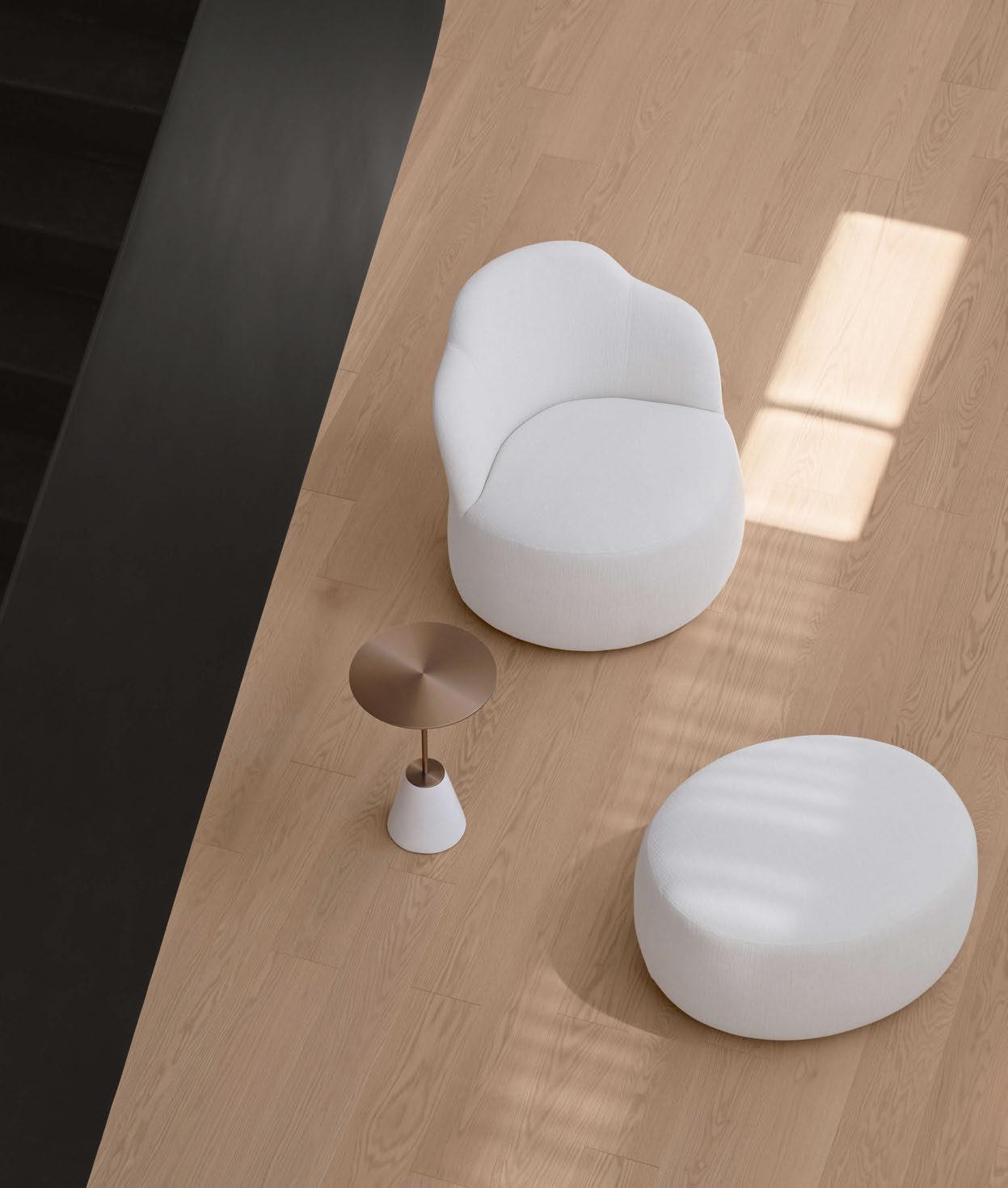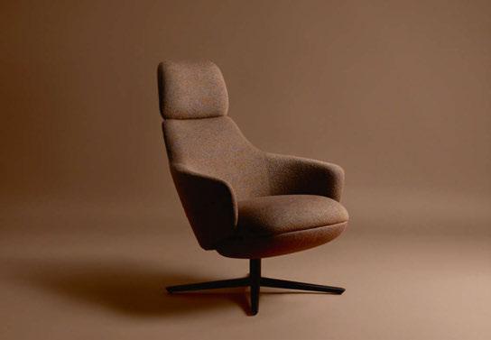 The Calma Lounge collection, designed by Benjamin Hubert, emphasises full-body comfort with a softly padded interior that envelops the sitter. Its fourblade swivel aluminium base creates a synchronised reclining system that can be locked in any position to respond to ergonomic considerations. Calma is available with an optional wider headrest to create a sense of privacy, and its exterior backrest can be wrapped in walnut plywood. The collection’s sustainable design omits glue, facilitating the individual removal of the upholstery for washing, replacement or updating, and allowing disassembly at the end of its life for recycling.