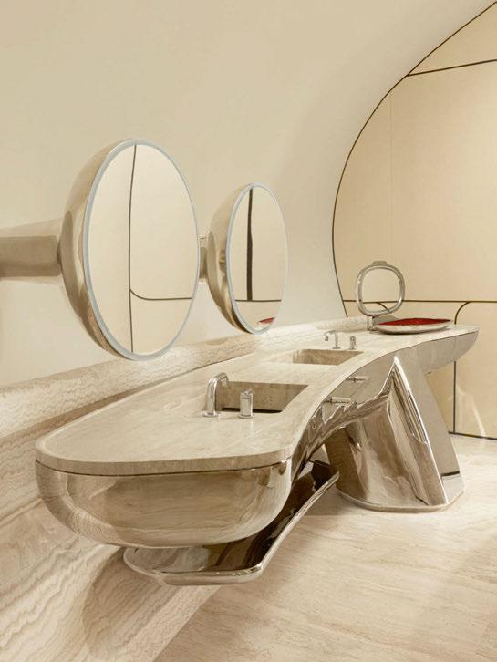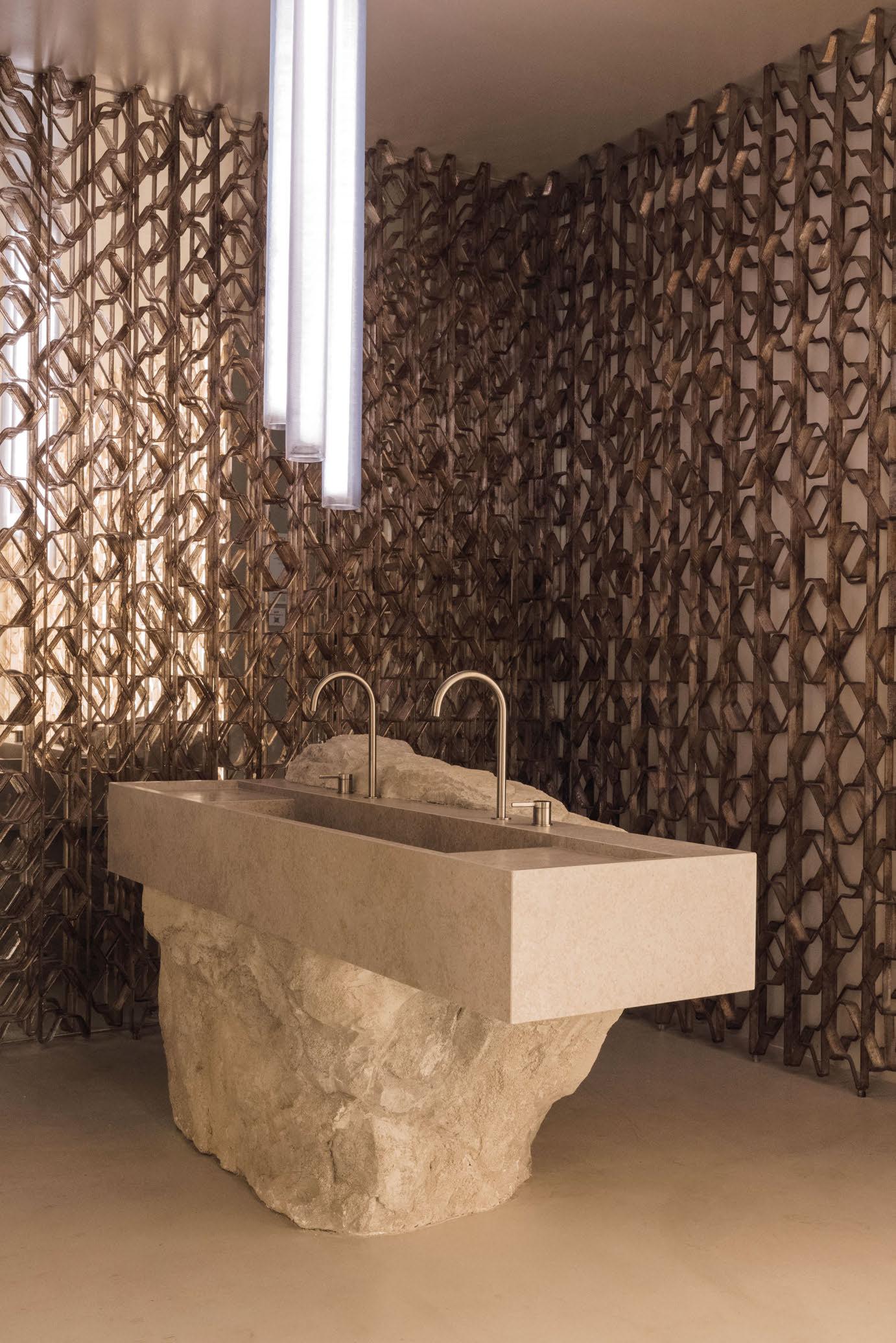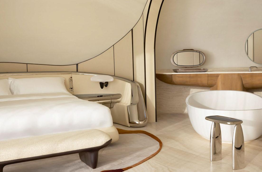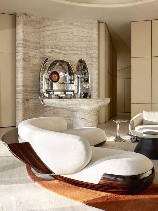 Born in Toronto, Paolo Ferrari traces his passion for design back to a childhood spent in his father’s carpentry workshop. Having mastered his craft at Yabu Pushelberg, Ferrari established his own multidisciplinary studio in 2016, and has since designed hotels, restaurants and bars around the world. In the creation of Shebara, the studio channelled the craftsmanship of luxury yachts, using a mix of leather, wood and travertine to create soothing interiors that complement the futuristic forms of the architecture.