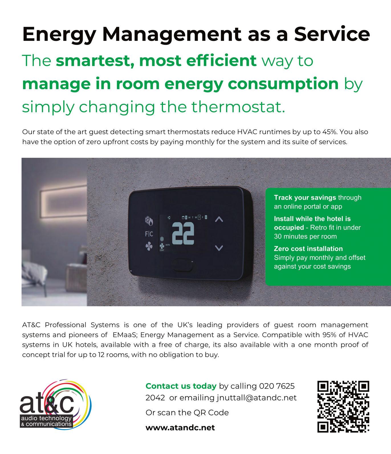 London-based audio visual technology integrator AT&C enables hotels to cut energy waste and carbon emissions while improving the guest experience through its Energy Management as a Service (EMaaS) model. Each Verdant Smart Energy Management guestroom thermostat is equipped with a built-in occupancy sensor, which enables the system to automatically adjust the temperature to an energy-saving level when the room is vacant, reducing HVAC runtime by up to 45% without any loss of comfort. For a monthly fee, the service includes professional installation, real-time monitoring, ESG data for reporting, lifetime hardware warranty and UK-based support. Operating in over 7,000 hotels worldwide – including IHG and Marriott properties – the system sees a typical return on investment in 12-18 months, alongside demonstrable reductions in energy costs and CO₂ emissions. Monthly reports support Scope 1 and Scope 2 ESG compliance, making sustainability progress transparent and actionable for both individual properties and multi-site portfolios. AT&C’s energy management system delivers improved guest comfort, easy maintenance, fault alerts and cloud access, measurable cost savings with OpEx flexibility, as well as real-time reporting and CO₂ reduction tracking. Now, AT&C are offering a complimentary 10-room trial, including professional installation, cloud monitoring, live support and ESG-ready reporting. Once savings are proven, hotels can scale quickly via EMaaS or CapEx models. www.atandc.net