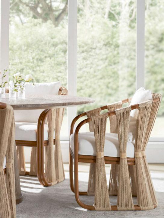 For nearly 50 years, Palecek has combined natural materials, centuriesold handcrafted techniques and contemporary designs to create timeless pieces. The Strings Attached armchair, built with a large gauge double pole rattan frame in a warm natural finish, embodies organic charm and lasting durability. The bundled abaca rope along the sides and back – finished in natural or espresso – creates a dynamic textural statement, balanced by the fixed upholstered seat and loose back cushion. Both are available in a variety of complementary neutral and patterned Palecek fabrics. Custom upholstery options are also available.