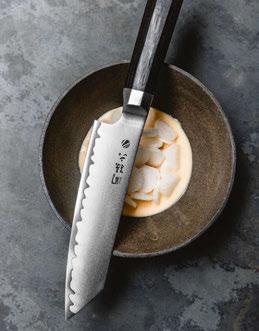 The Kaname knife, part of KAI’s premium Seki Magoroku Master Line series, features traditional san mai construction – three-layered steel blades designed for performance and durability. The Kiritsukestyle blade, with its signature tapered design and rear notch, is designed for comfortable and safe handling. Meanwhile, at the core of each blade is VG Xeos steel encased in two layers of tough stainless steel, creating long-lasting sharpness that reduces food resistance during use and ensures precise cuts. An intricately handcrafted handle made from black-grained pakka wood is shaped in an octagonal, ergonomic form for a comfortable, balanced grip. www.kai-europe.com