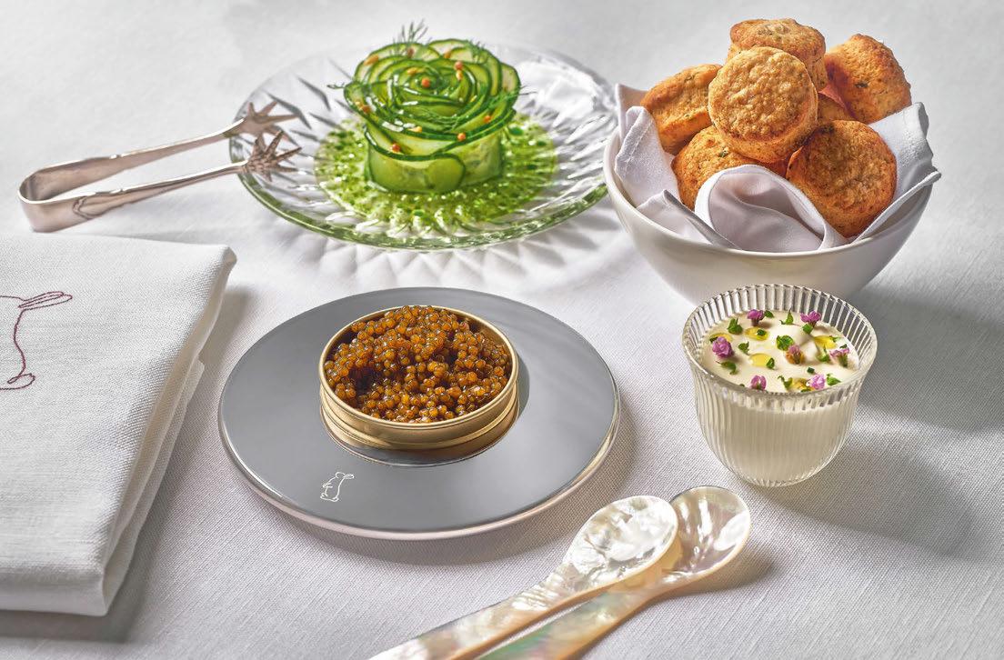layers of blackberry and beetroot mousse, with a heart of lychee and a yellow ladybird perched on a chocolate sable; Apricot Mille-Feuille - a crisp, caramelised puff pastry layered with apricot and honey compote created with help from the hotel’s rooftop beehives; and finally, Raspberry Magic Mushroom - a raspberry jelly and lemon foam topped with caramel tuiles and white chocolate spots. Accompanying drinks include berry and hibiscus, rhubarb and rose, elderflower and apricot iced tea, or perhaps a chilled glass of Bollinger.