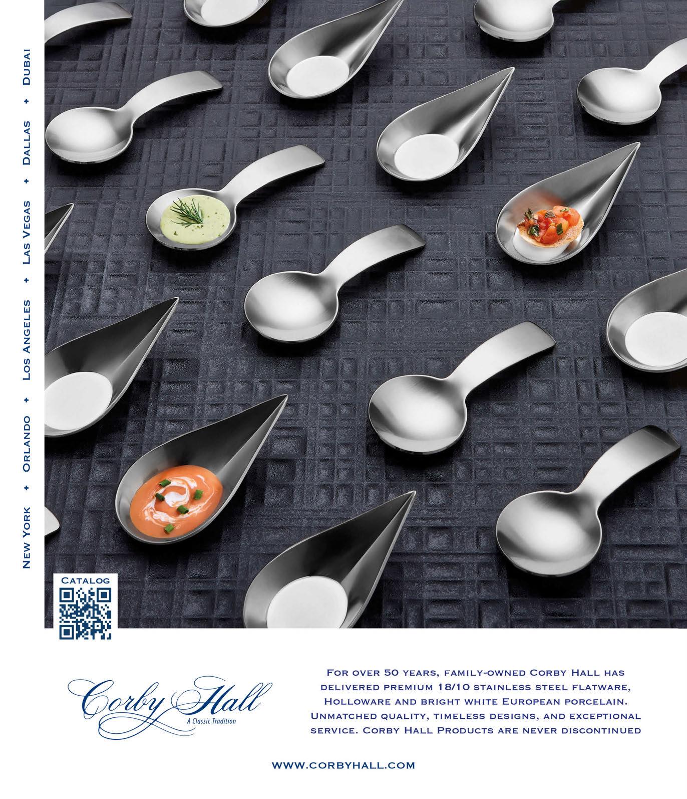 Corby Hall, a family-owned business based in Randolph, USA, has supplied the international hospitality industry with high quality flatware, holloware and bright white porcelain dinnerware for the past 50 years. With designs ranging from traditional to contemporary at competitive price points, Corby Hall has the ability to supply all food and beverage outlets associated with a full-service operation. A global distribution network coupled with production facilities in Europe and Asia allows for seamless service for both opening orders as well as re-supply. Corby Hall now introduces Amuse Bouche Spoons, perfect for refined, single-bite presentations.