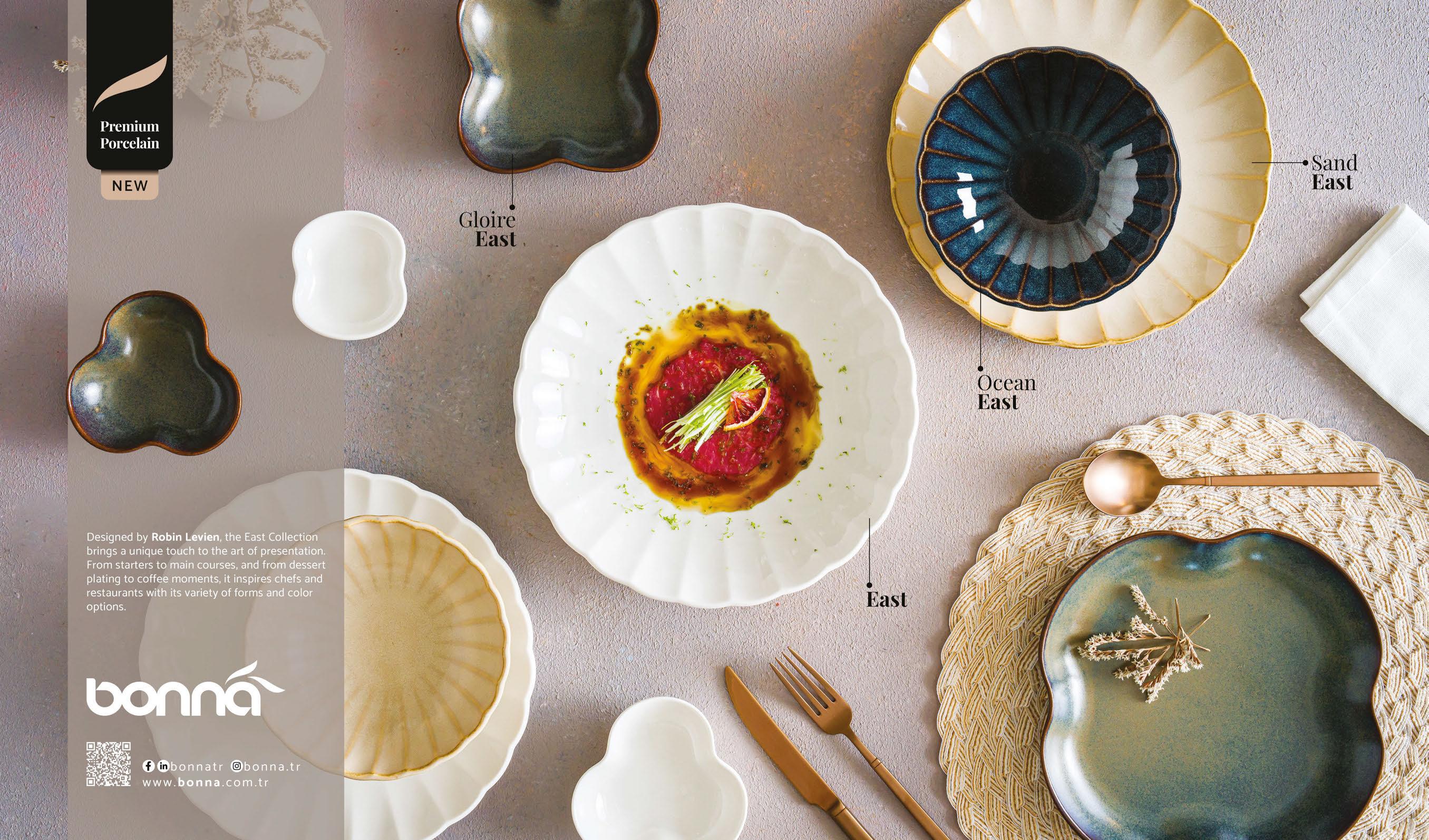 Designed by ceramist Robin Levien, the East collection from Bonna draws inspiration from the delicate flowers seen in the Far East. The collection complements a variety of dishes, from starters and mains to desserts and coffee service, with two distinct plate shapes and a wide colour palette for chefs to choose from. Bonna, a Turkish tableware brand since 1981, blends traditional craftsmanship with modern design and technology. Known for durable, highquality porcelain, the brand serves the needs of hospitality professionals and discerning consumers alike and is globally recognised for both design innovation and customer satisfaction.