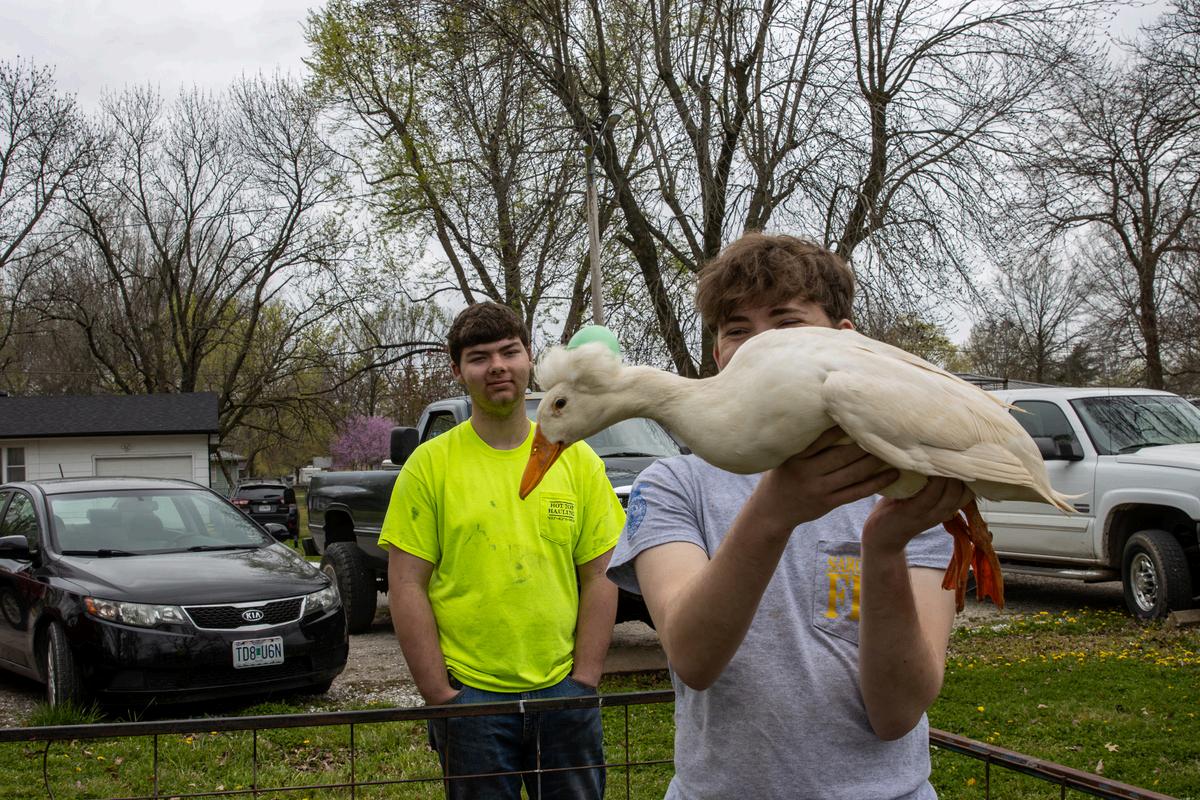 Reily Rupp show us his duck with Nathan Ogle closely observing
