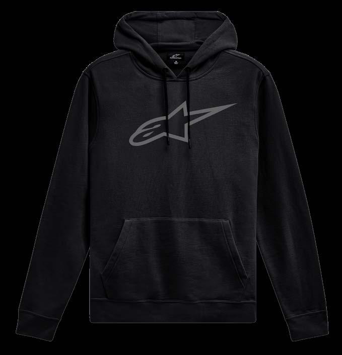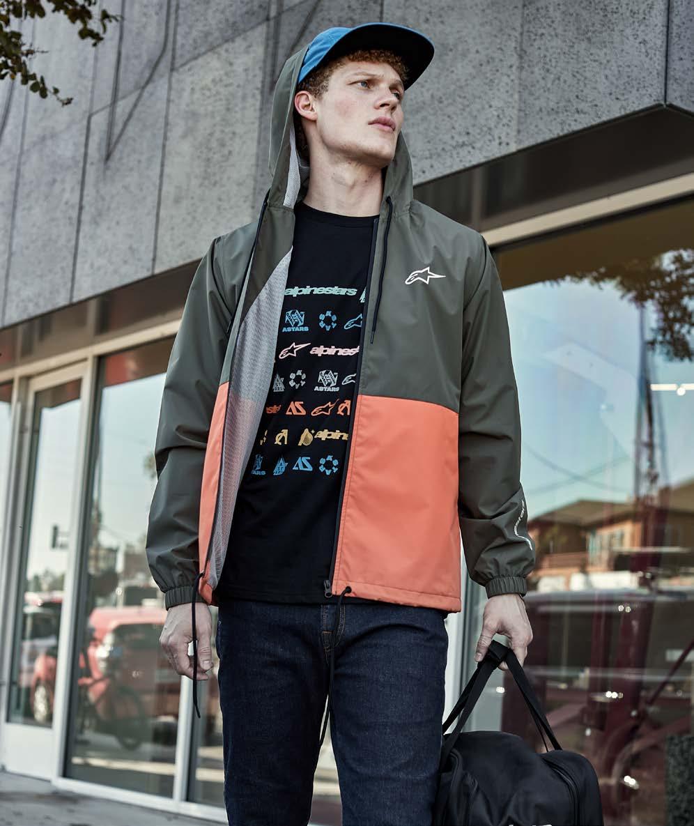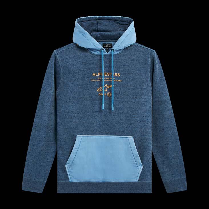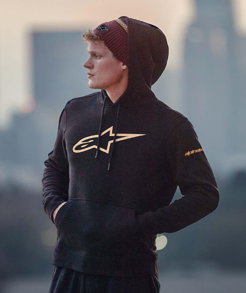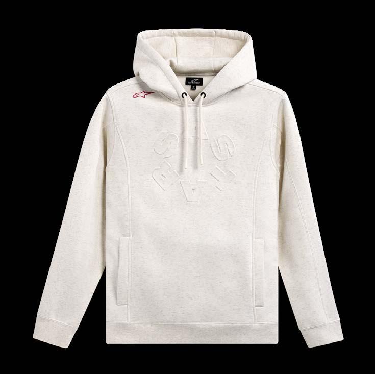 Agless logos at chest and should piecing. Large wordmark across hood.