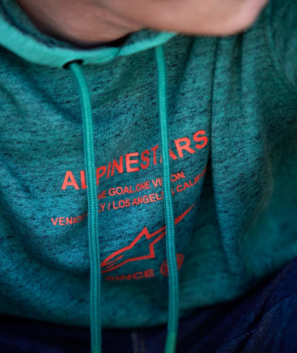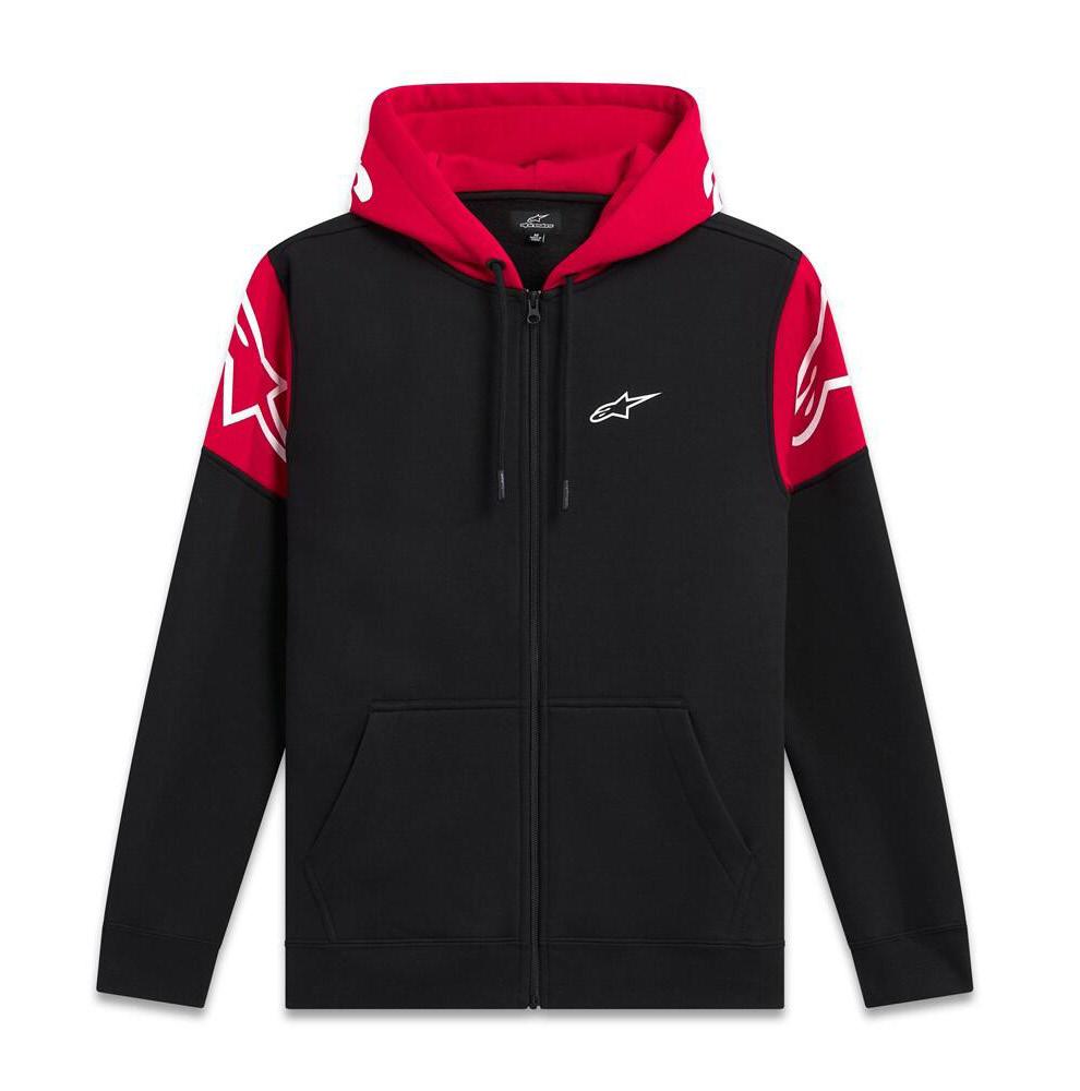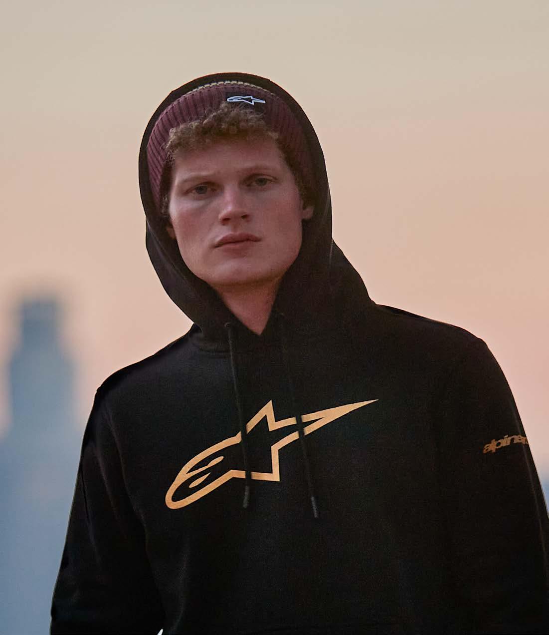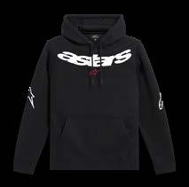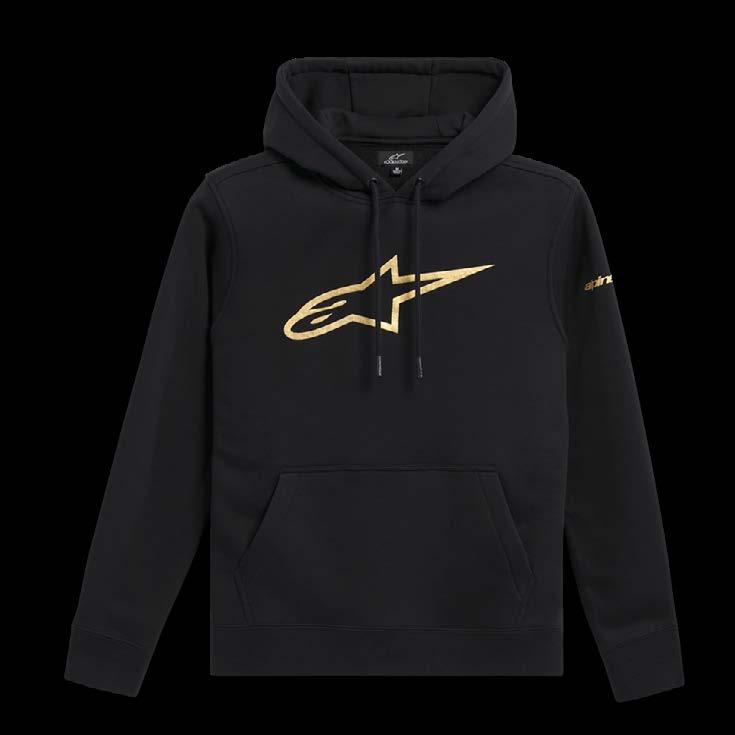 Agless logos at chest and should piecing. Large wordmark across hood.