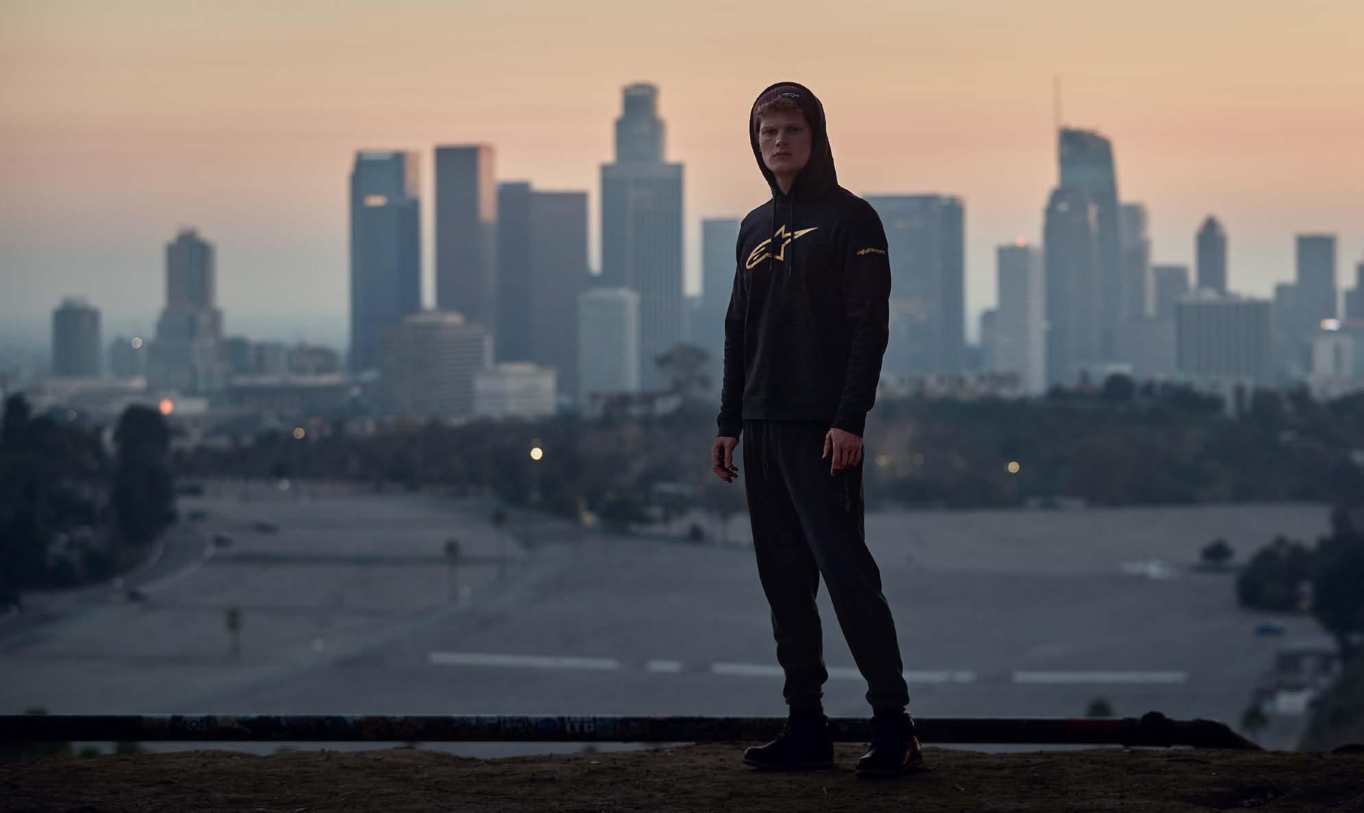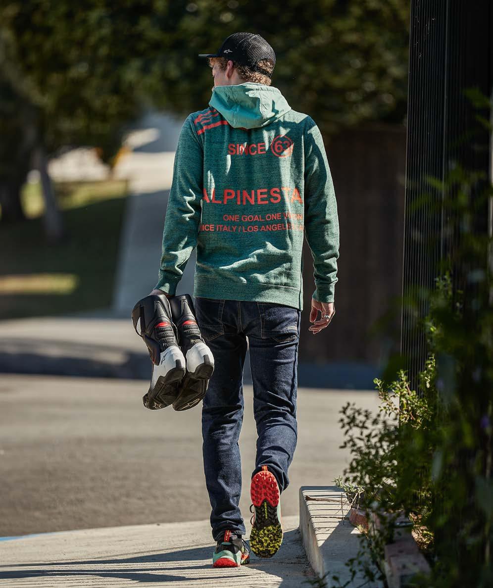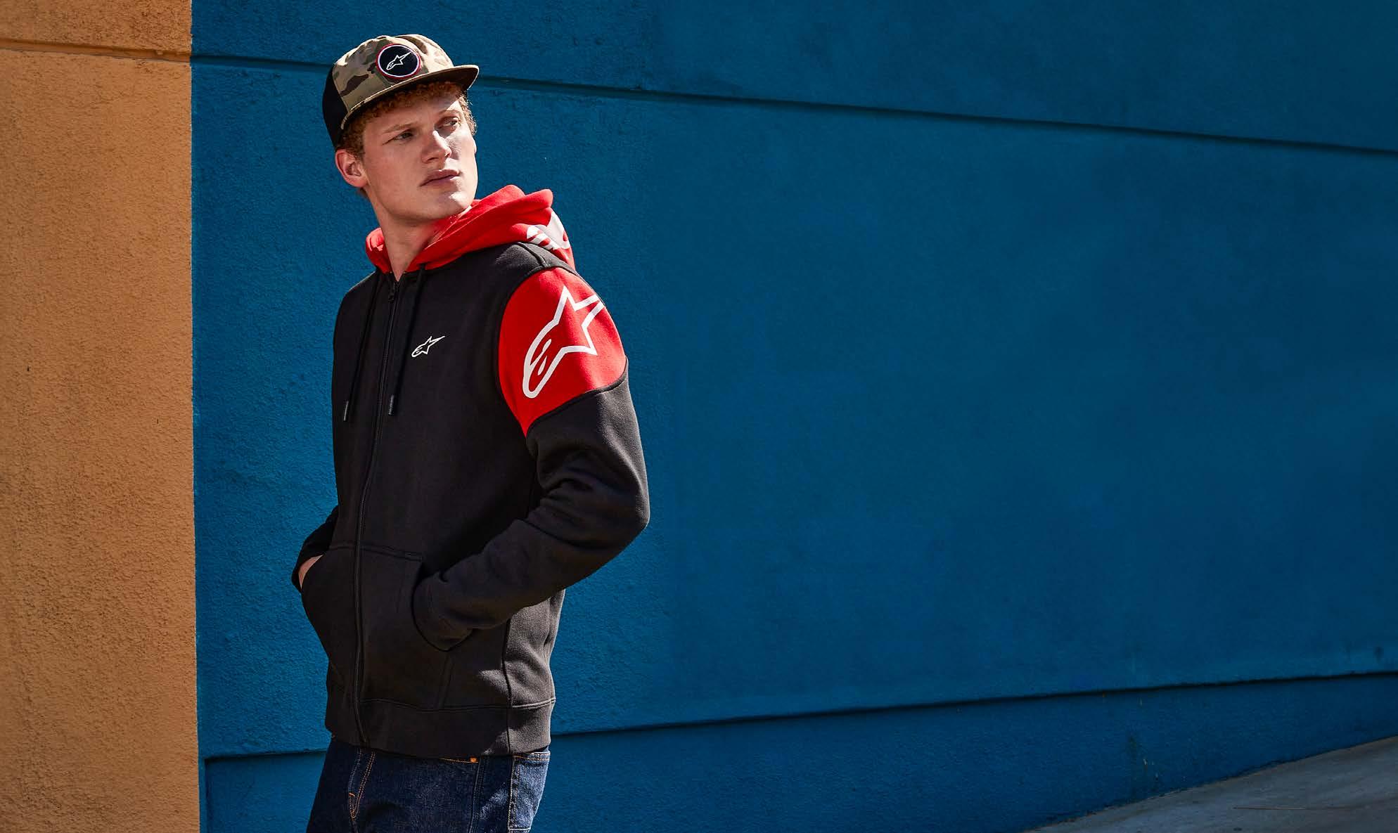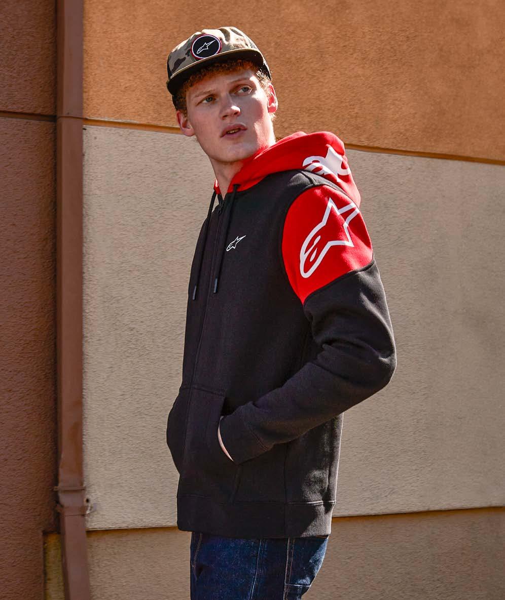 Agless logos at chest and should piecing. Large wordmark across hood.