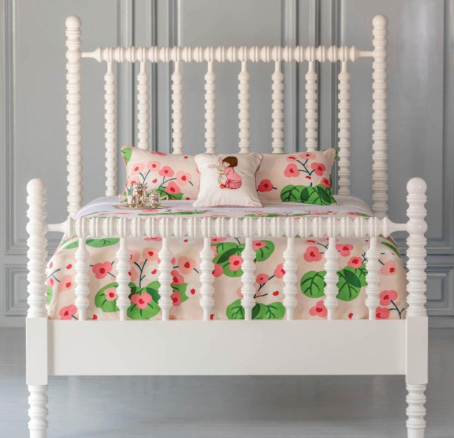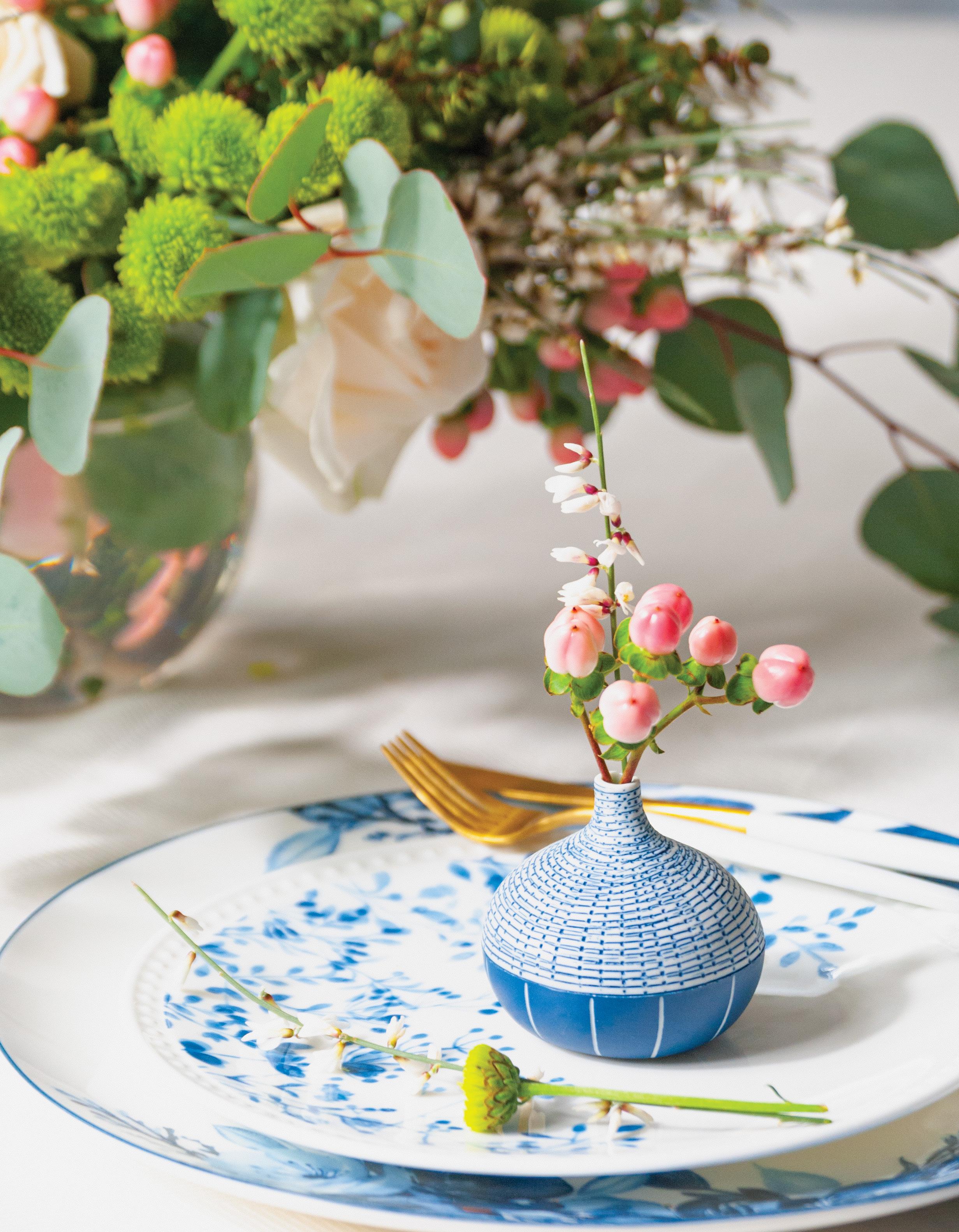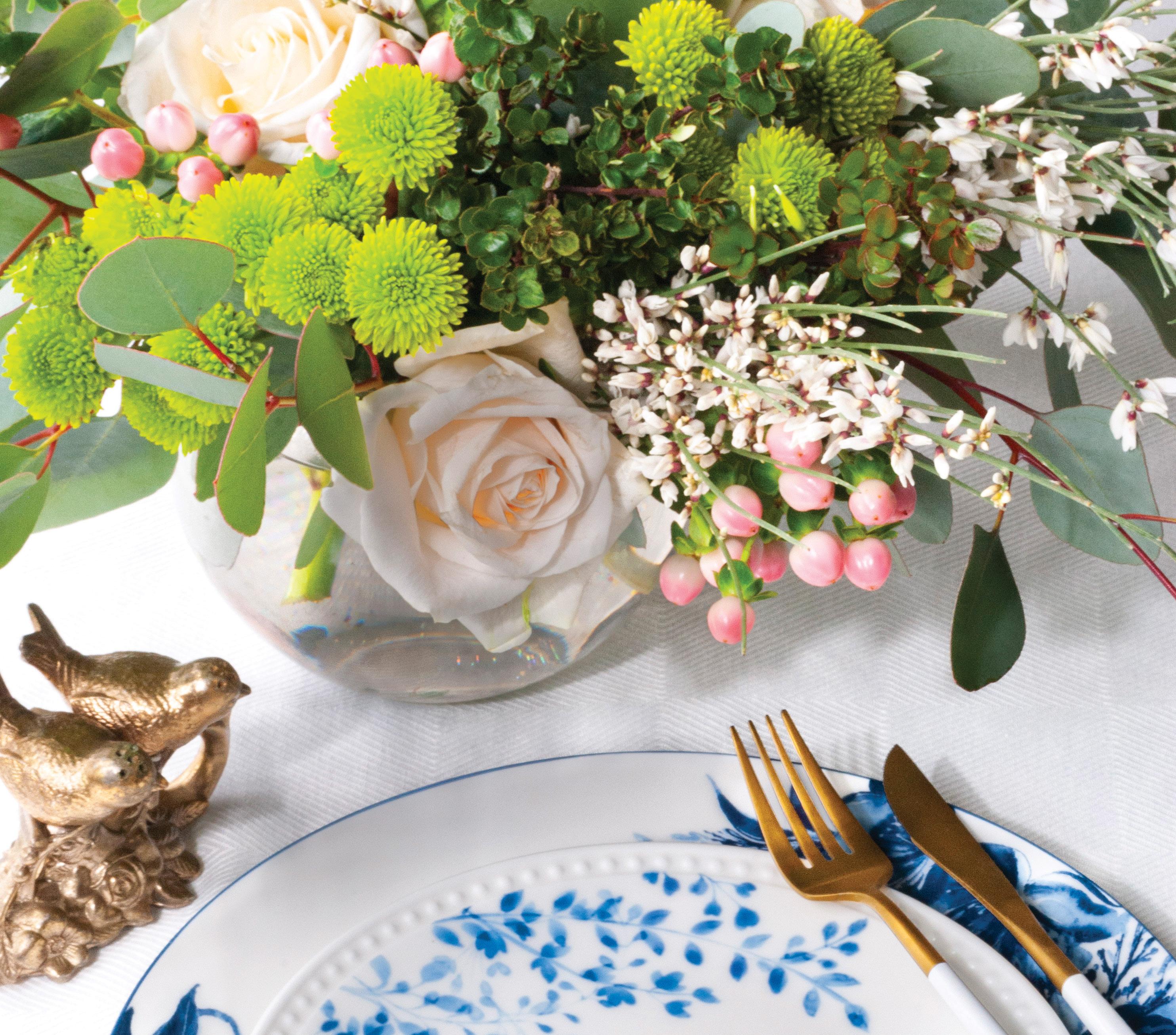 A seasonal market mixed bouquet is all you need to create a spring centerpiece arrangement. To portray the feel of blooming cherry blossom, add a splash of long-lasting ornamental St. John’s wort to the bouquet and table vases. Splurge on dainty gold napkin rings and modern white-andgold flatware to complete the look.