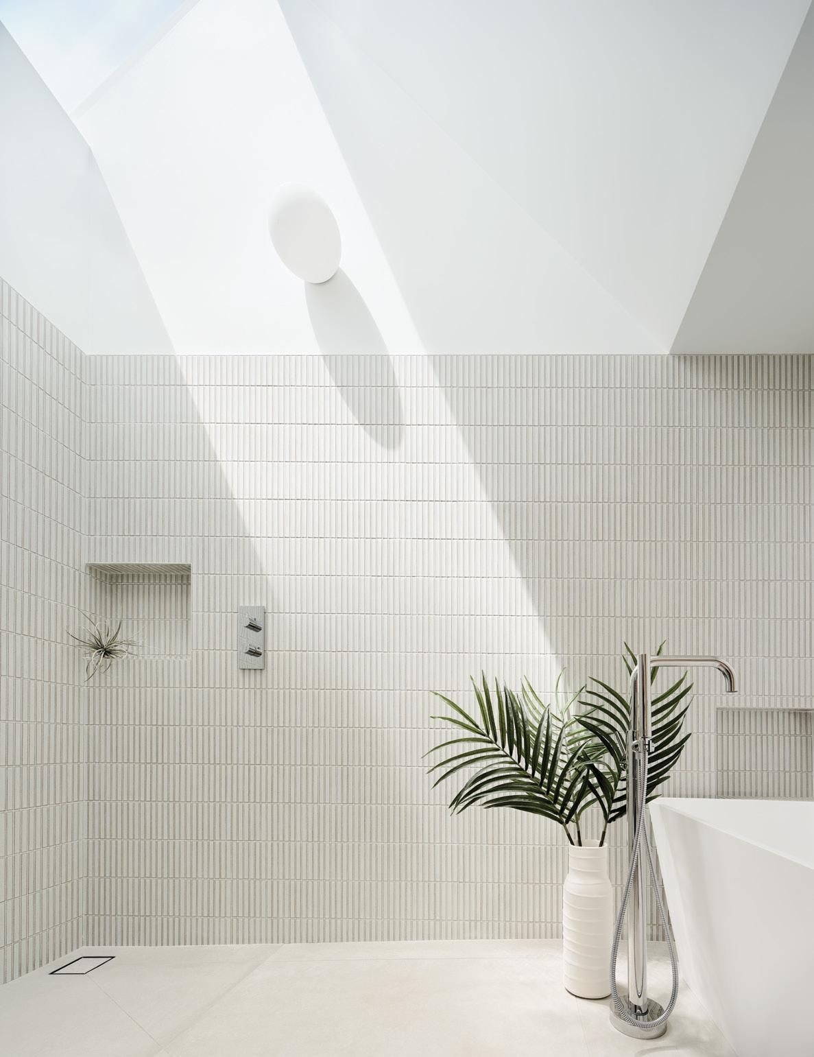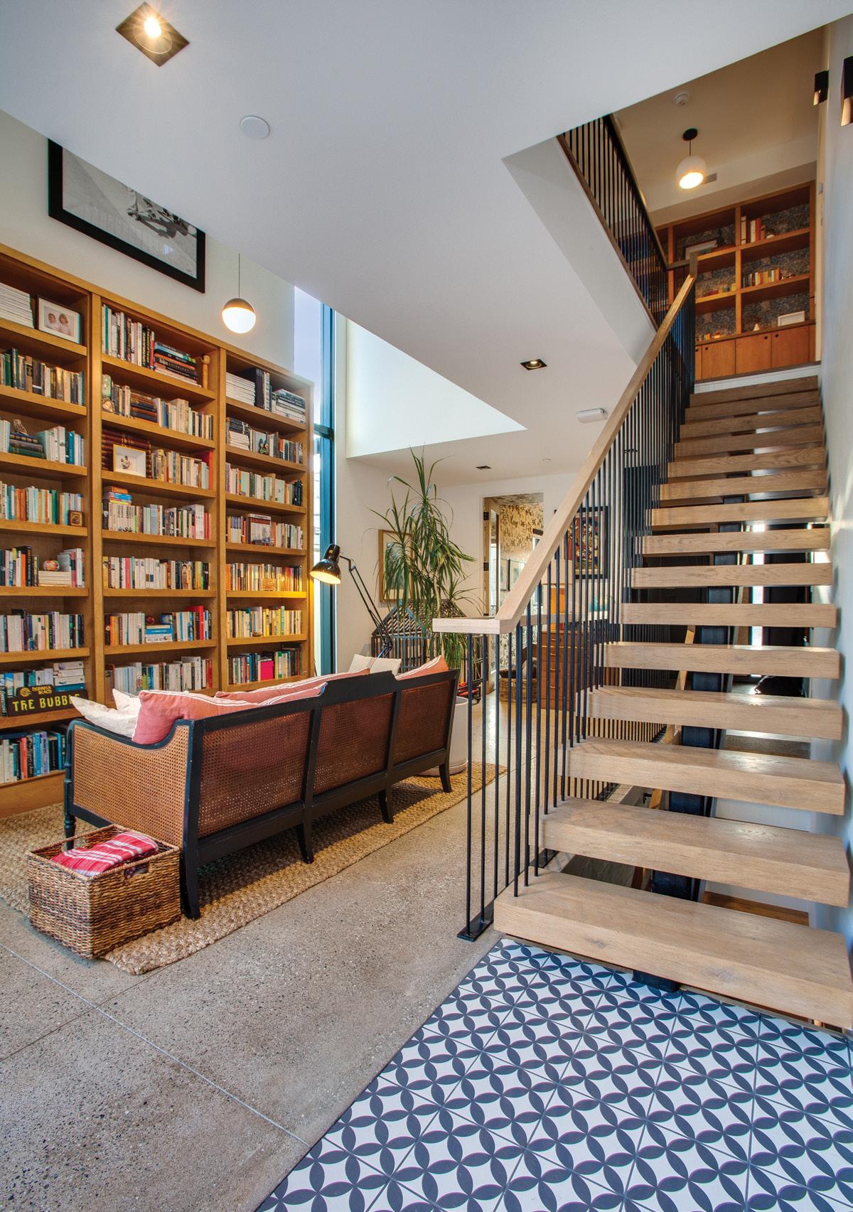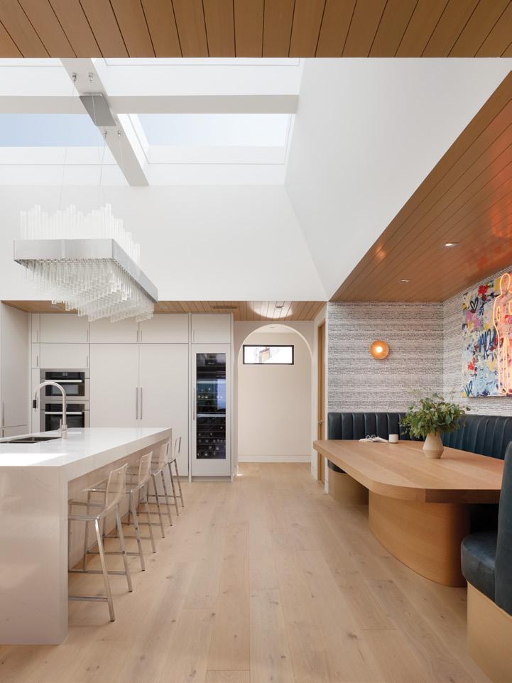 Constrained by zoning height limitations, the existing low ceilings of the upper level are punctured with a series of oversized skylight wells, which add volume and natural light throughout—they also act as quasi thermal chimneys, helping to passively cool the home.
