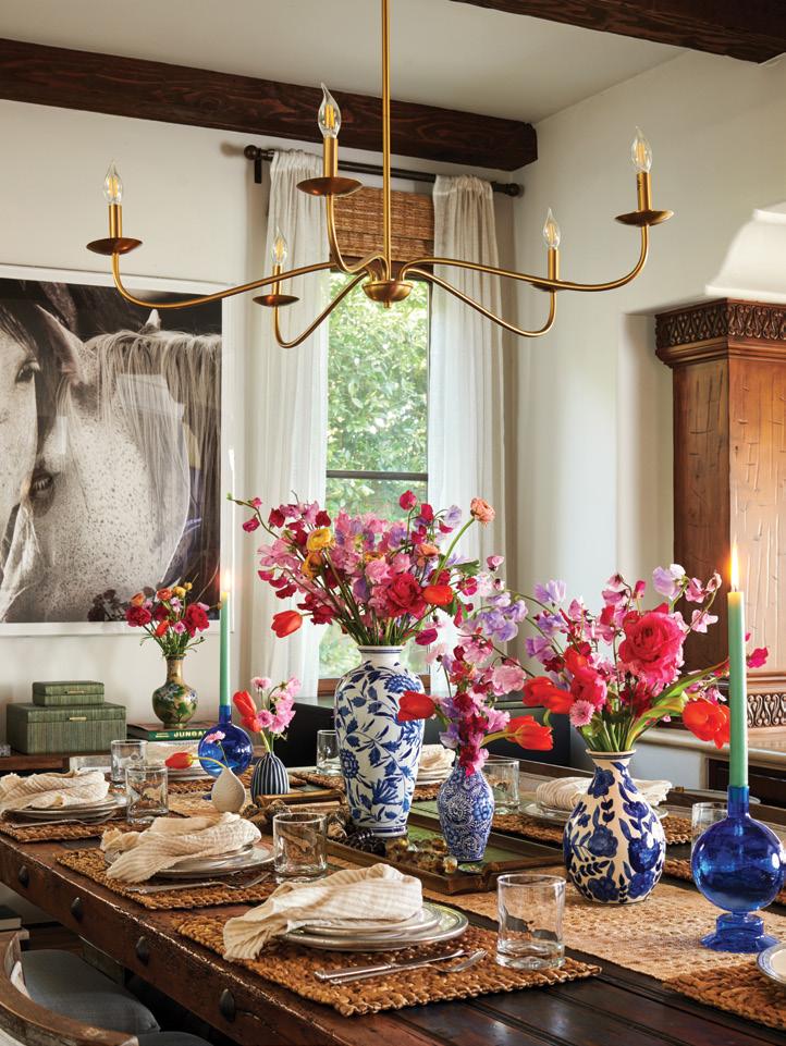Coastal blue and bright white place settings are perfect for a California-inspired spring table. Add sophisticated, eye-catching details like the mini blue-and-white patterned Thai vases. Elegant vintage stemware helps elevate the look. However, if you plan to entertain alfresco, we recommend crystal-like acrylic glassware instead. Marin deep