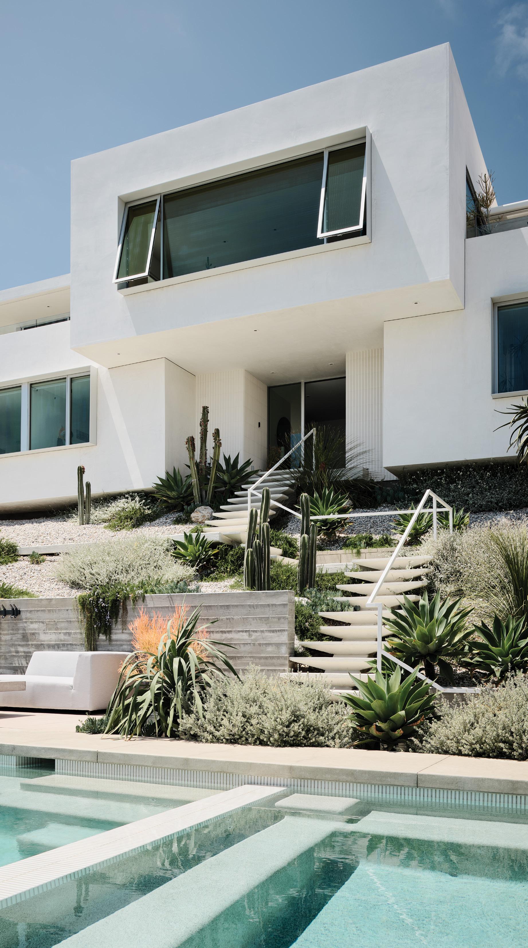 New deck areas and a pool are folded into the entry sequence, creating a courtyardlike space that integrates into the hillside. Landscaping with native and regionally appropriate plants ties the home together with the surrounding natural context.