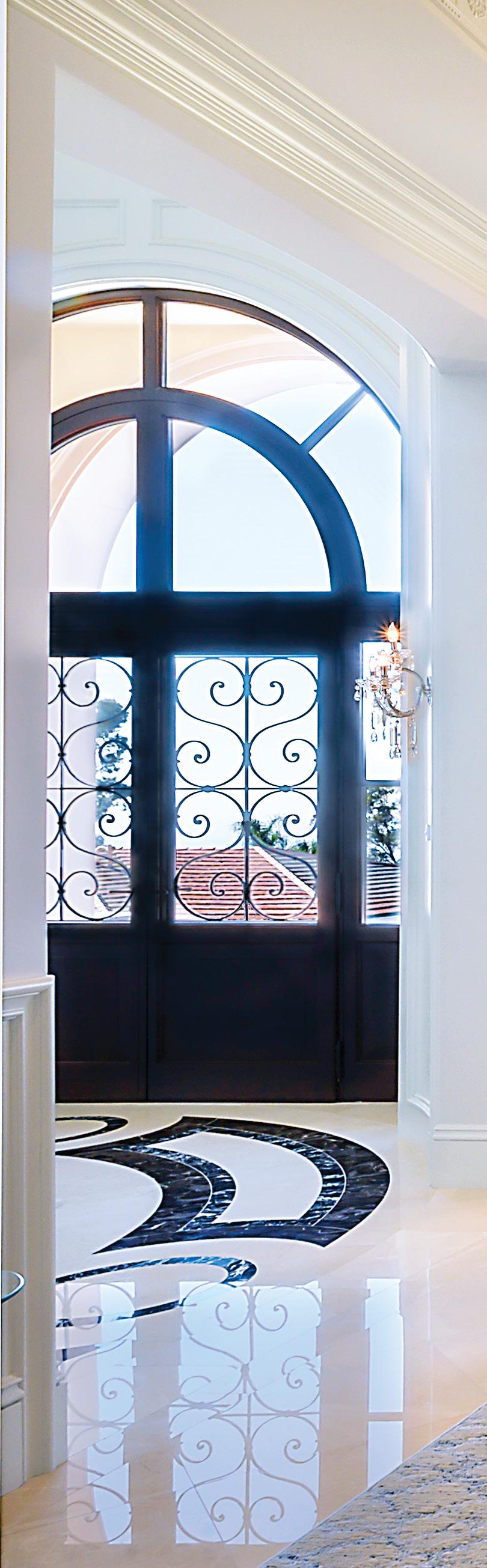 The soaring 25-foot-high entry foyer’s circular ceiling holds a 7-foot-diameter chandelier of crystal and Murano glass. This and the dining room chandelier were made by an Italian company whose chandeliers grace public halls and residences throughout Europe. On a sunny day, the crystals create a delightful burst of rainbows across the walls.