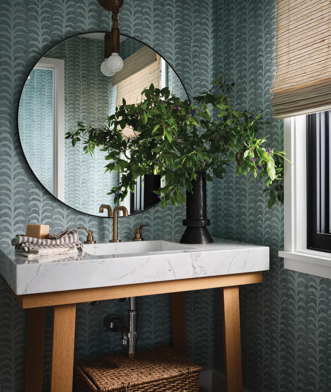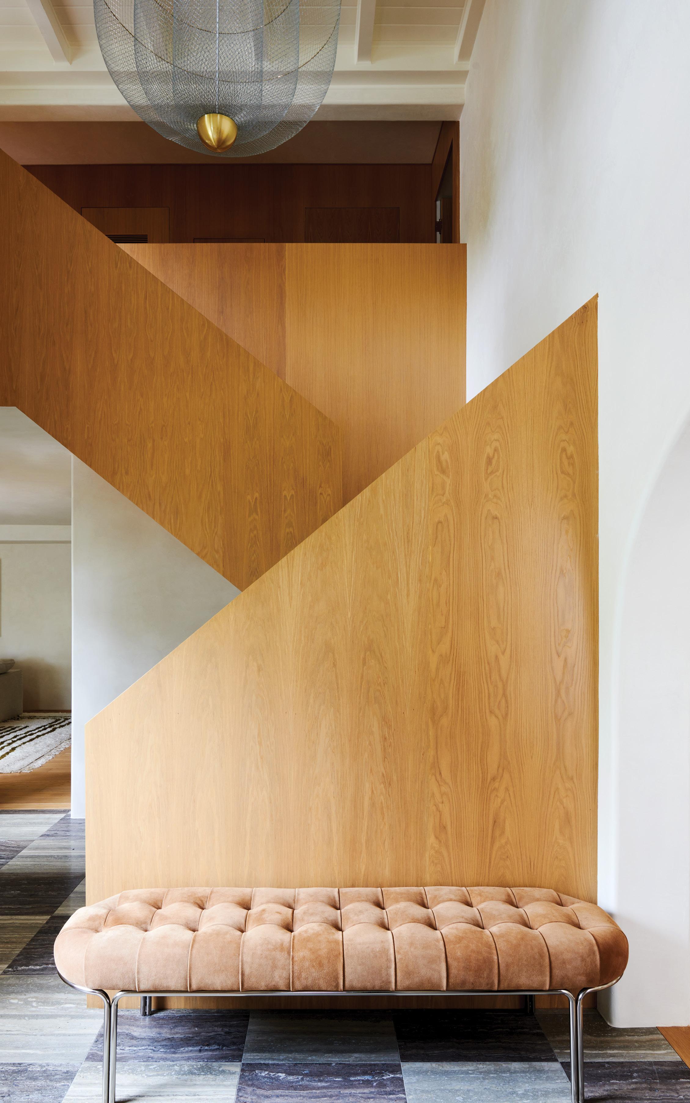 In choosing plaster versus other materials, she was able to incorporate an imperfect-like effect throughout. “I like to make choices that feel calming, and with plaster I like that it’s not perfect and pris tine,” she says. “Everything that I choose, from the wall finishes to the stone and the lighting, that’s my ‘trifecta.’ I want there to be moments of in-your-face design—like the onyx bench in the sitting room. It’s about showing restraint and making each room have its moment.”
