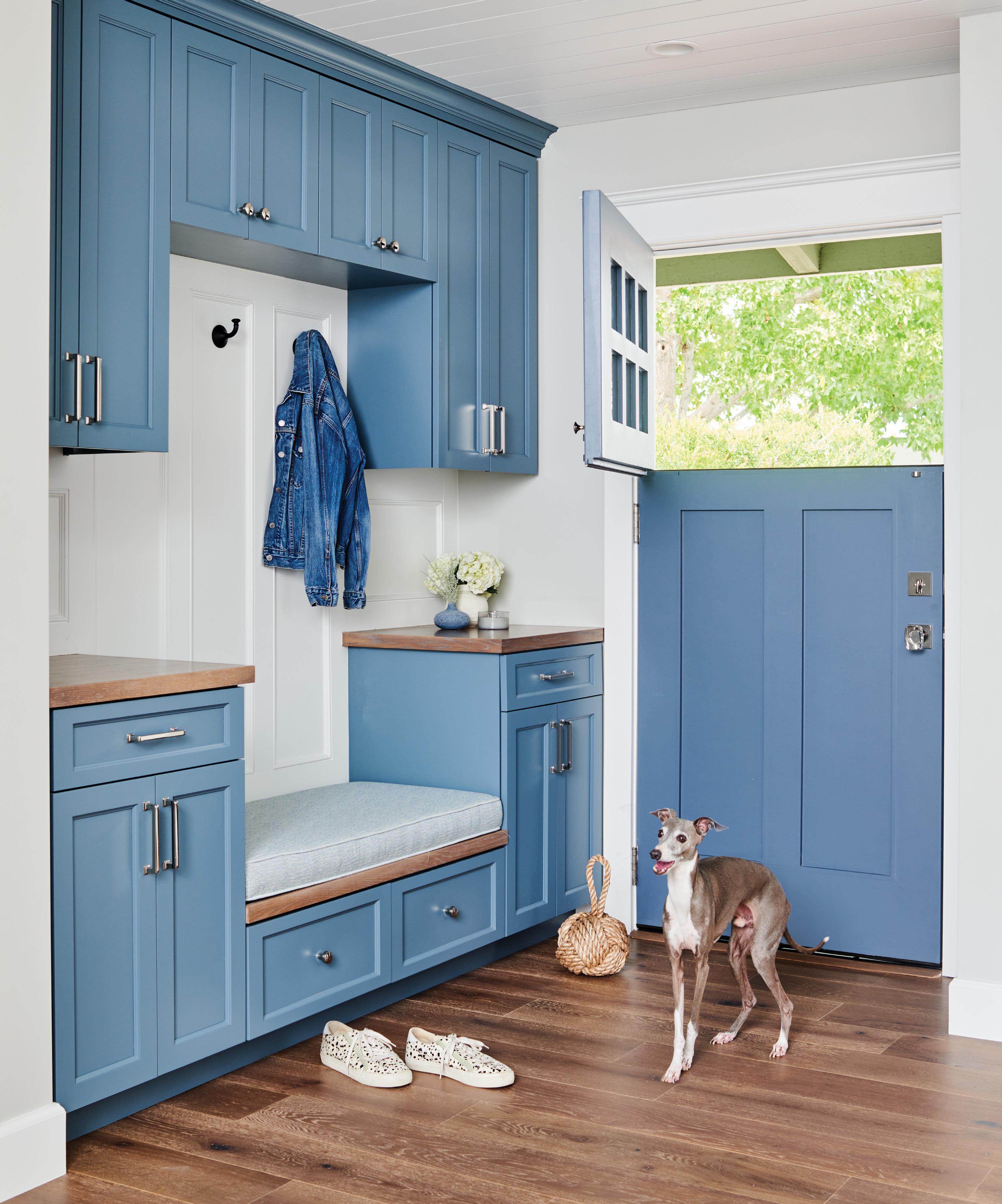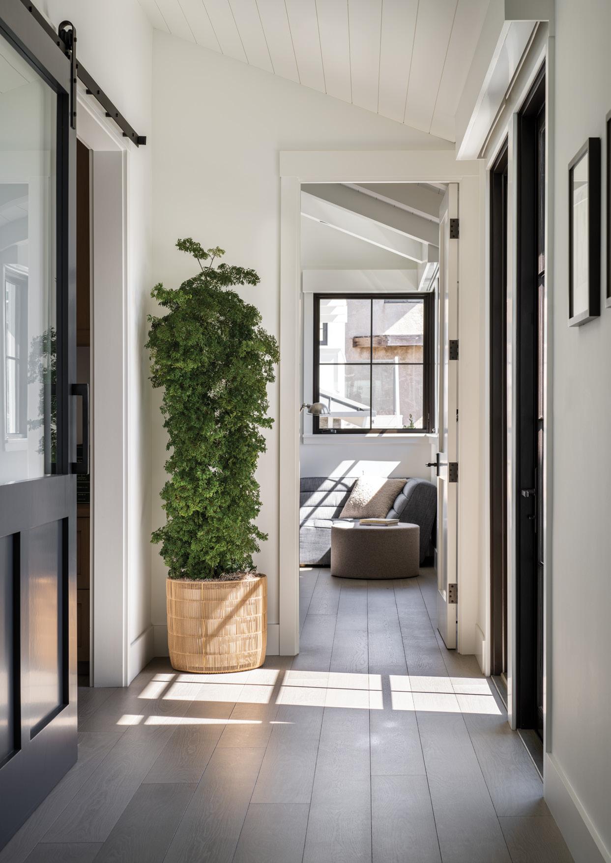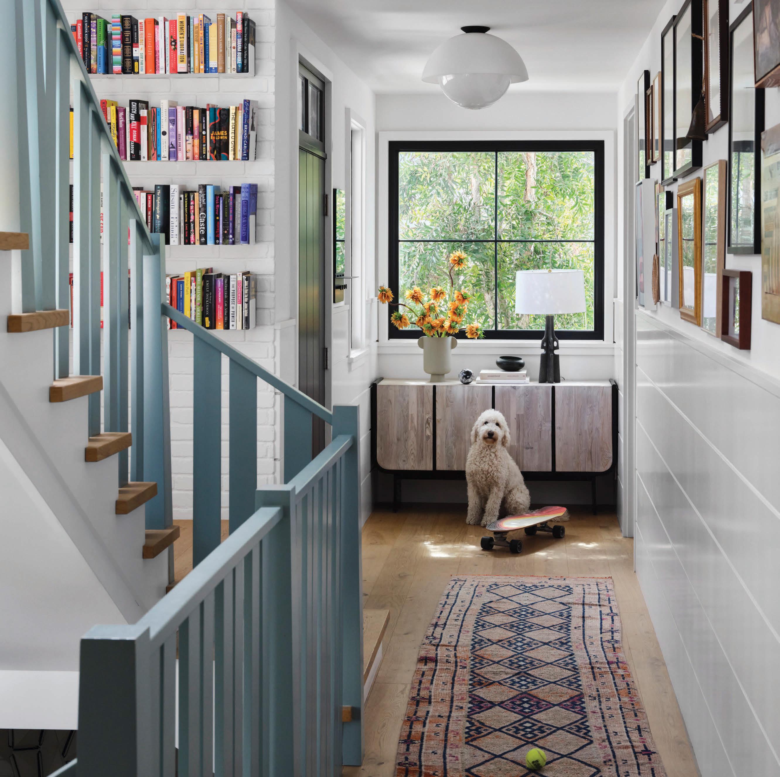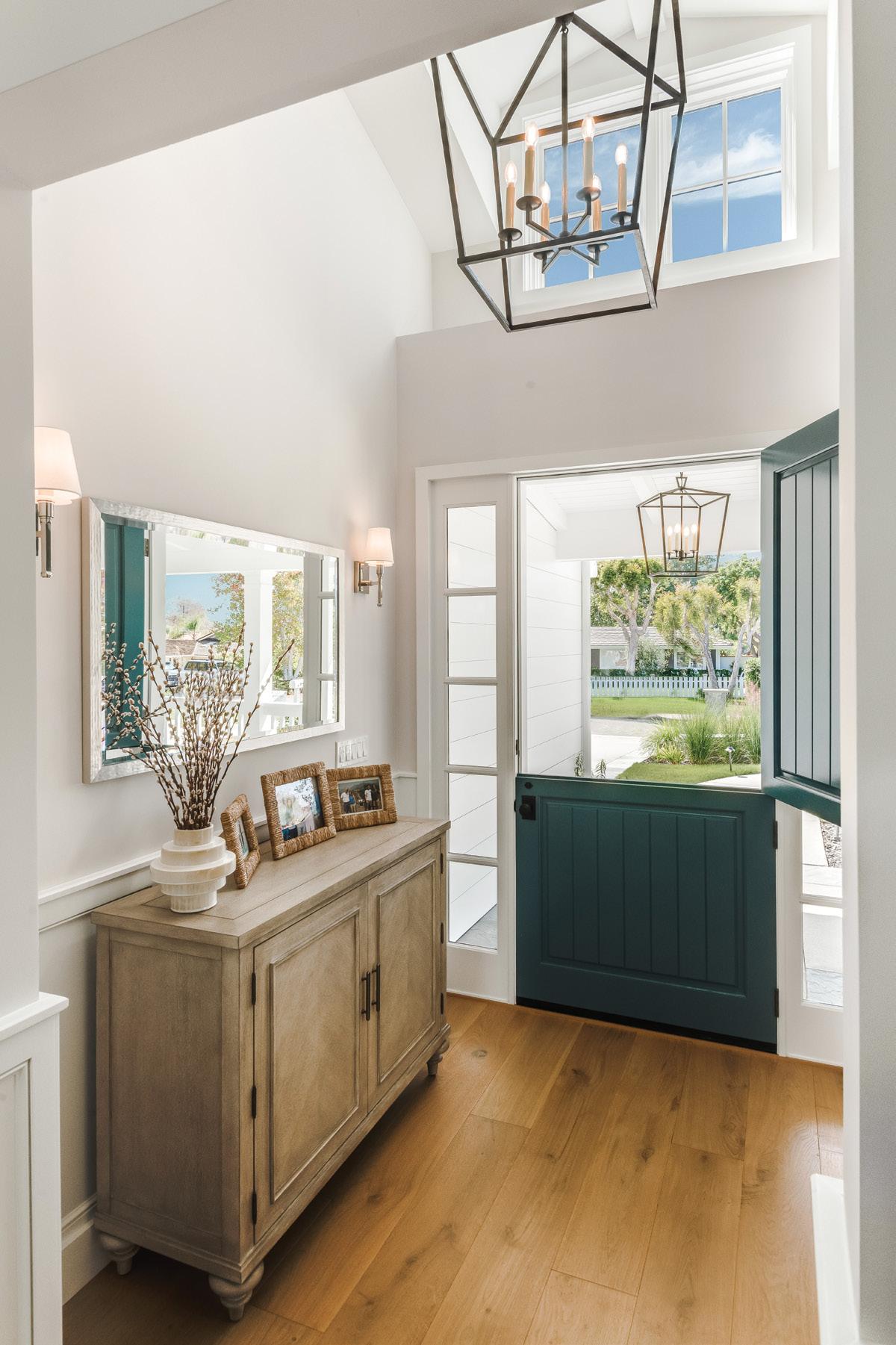 The classic Dutch door reinforces the neighborly vibe, bringing outdoor space, light and air inside. High ceilings, a symmetrical dormer window and a dramatic hanging fixture say, “You have arrived!”