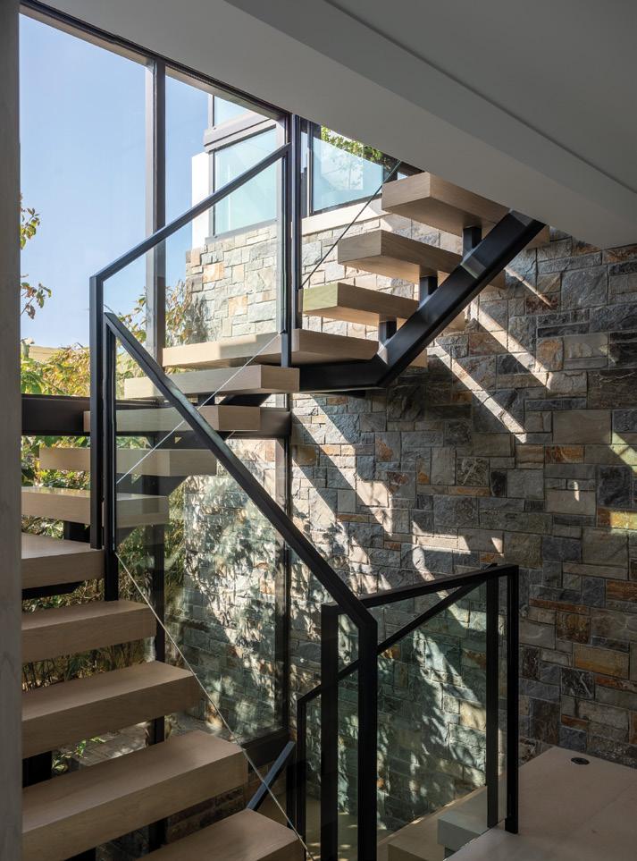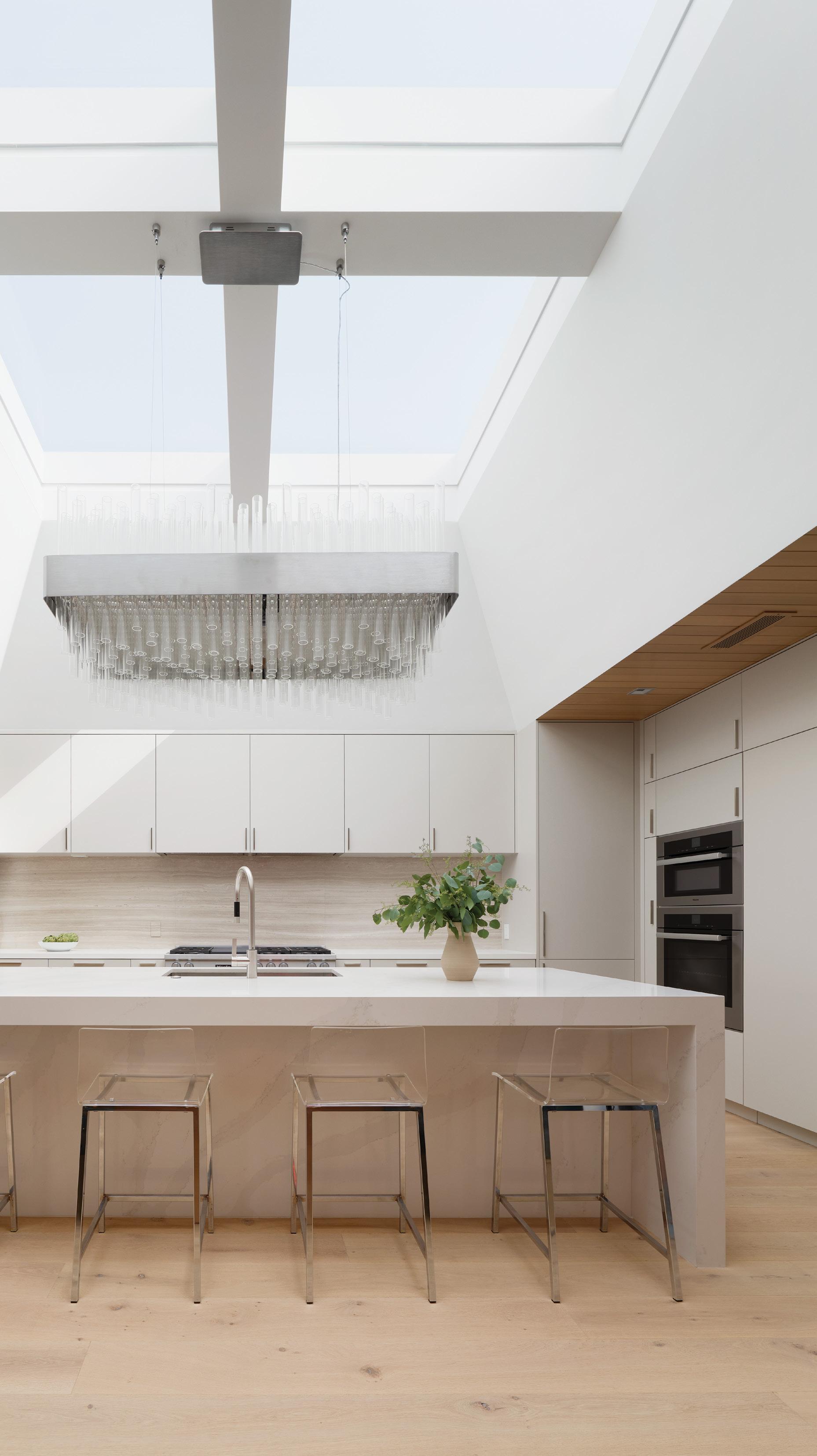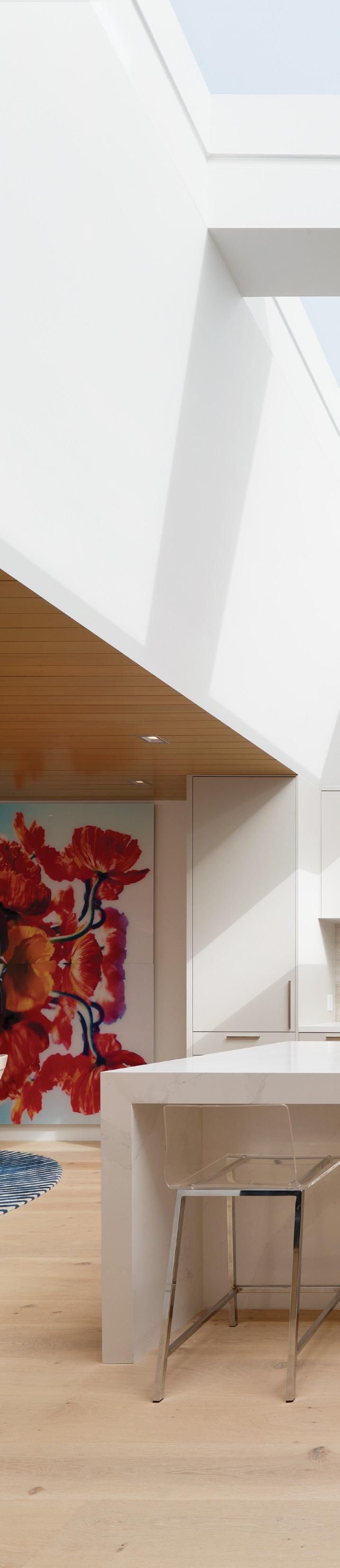 As architects, we have the privilege of playing an important role to propel sustainability efforts for ward. Our strategies are varied and include every thing from recycling greywater to reducing waste during construction or specifying local, durable, materials free of toxins on our projects. Our favor ite strategies are the ones that not only improve the environment but elevate our clients’ lifestyles. We always look for ways to leverage natural light to decrease energy consumption, such as in this project’s enormous skylight, which transforms an entire floor of a home. During our most recent heat wave, we heard from one of our clients that their home stayed wonderfully temperate without any air conditioning due to the passive heating and cooling systems we installed.