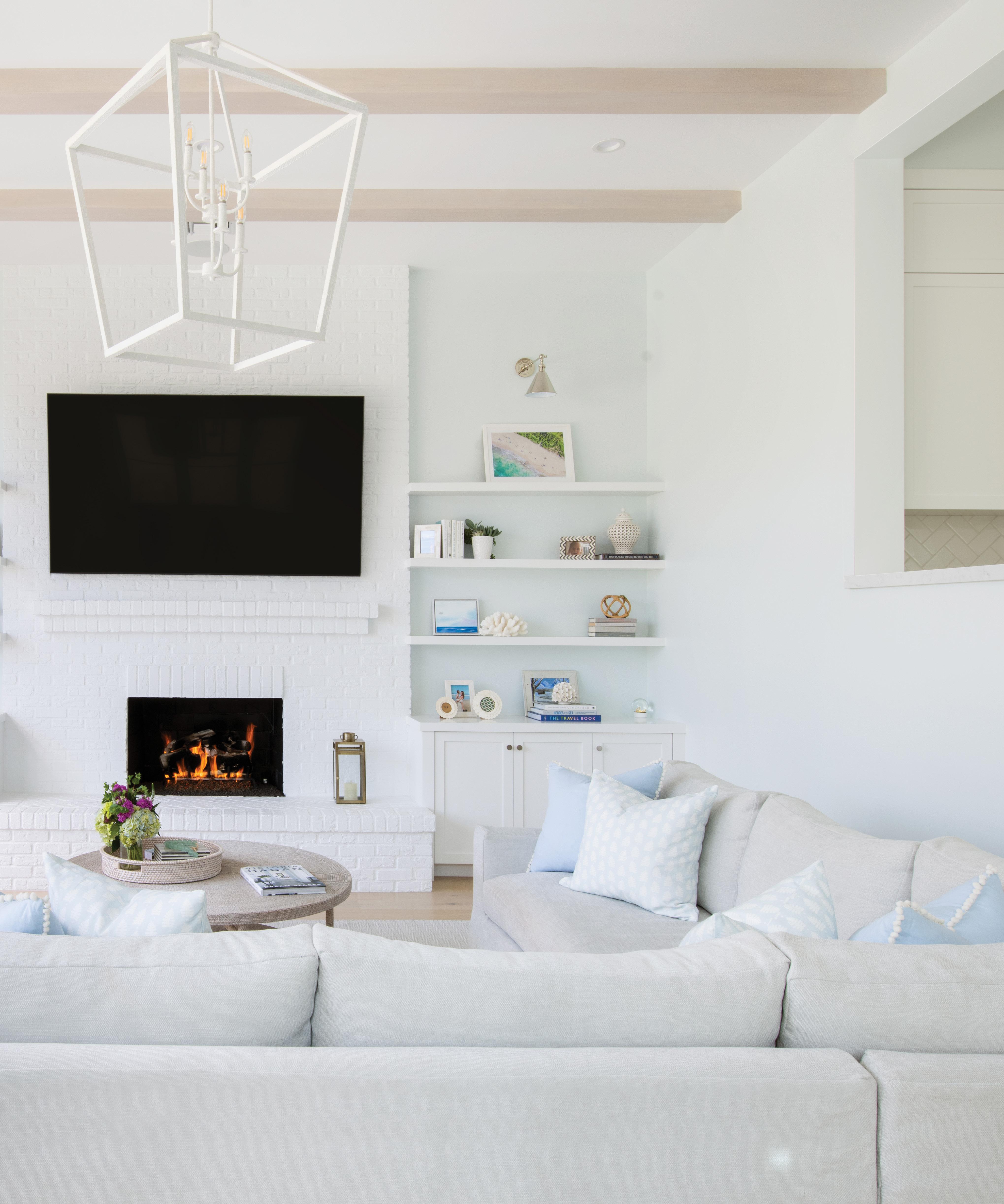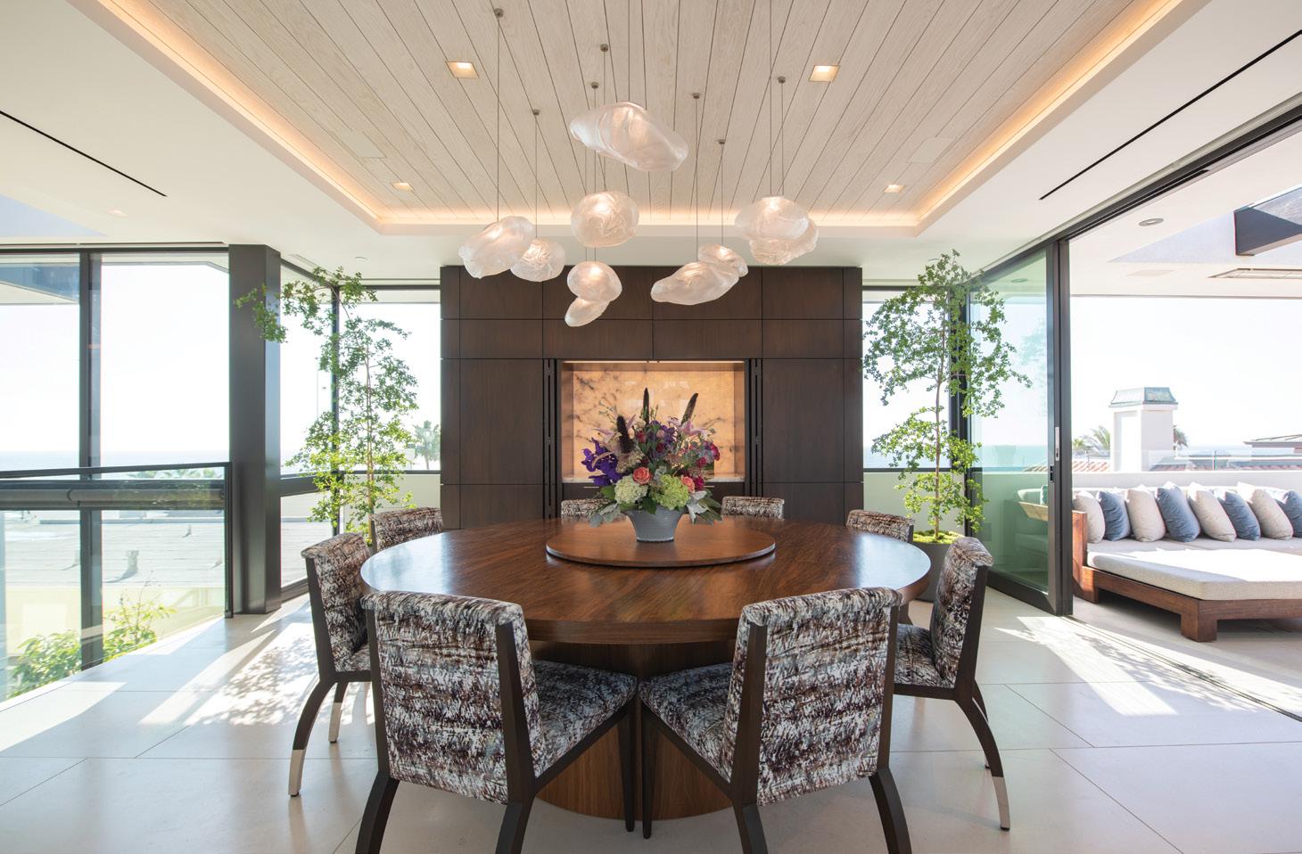 PHOTOGRAPHED BY JOE FLETCHER; TEAM SHOT BY SIRI BERTINGOur clients asked us to design a dream space that transported them to a resort-like atmo sphere while being in the comfort of their home. We developed a serene and calm color palette and mixed interesting materials such as iron, oak and marble. While designing, we envisioned how this entertainment space would accommodate large gatherings for holi days, Monday night football games and festive dinners. We created multiple complementary spaces throughout the home that flowed from one room to the next, all allowing the ocean views to be the relaxing focal point.