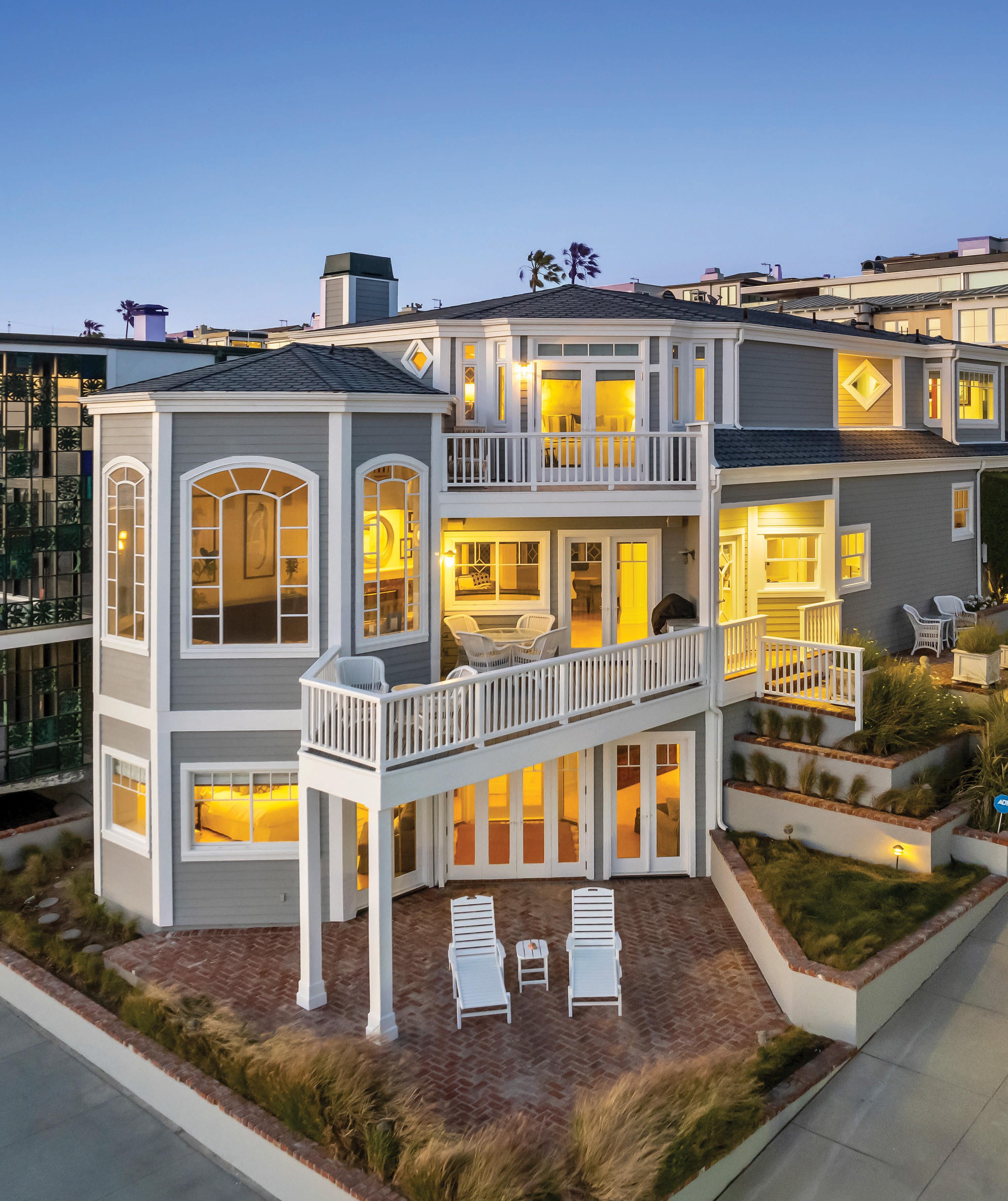 PHOTOGRAPHED BY KARYN MILLET; TEAM SHOT BY SIRI BERTINGLocated on a walk street along the coast in Man hattan Beach, this home incorporates modern European features inspired by the architecture of Alys Beach. The staple of the house is the expansive top floor with views from end to end, designed with sliders that open onto a large bal cony overlooking the Pacific Ocean. On the other end is a sunny morning room with a skylight and corner windows facing the Peninsula. At the ground-floor level, the front courtyard is nestled in planters to provide privacy within the busy beach area. The home’s exterior is composed of white stucco and clean, sculptural details. Glass balconies paired with hints of iron and oak intro duce a variety of earthy textures.