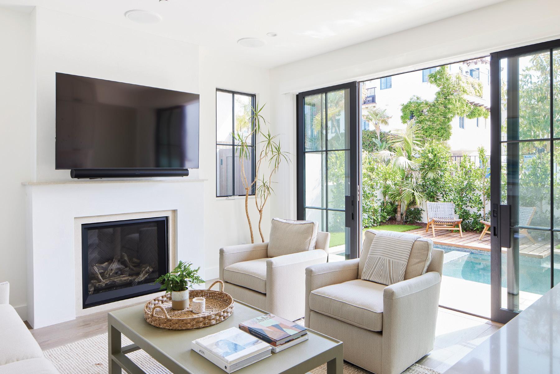 Indoor-outdoor living in Southern California is a must! A deep porch with fireplaces, TVs, fans, heaters and furnishings create a wonderful outdoor room useable in most weather conditions. Stacking doors allow for blending of both spaces as needed.