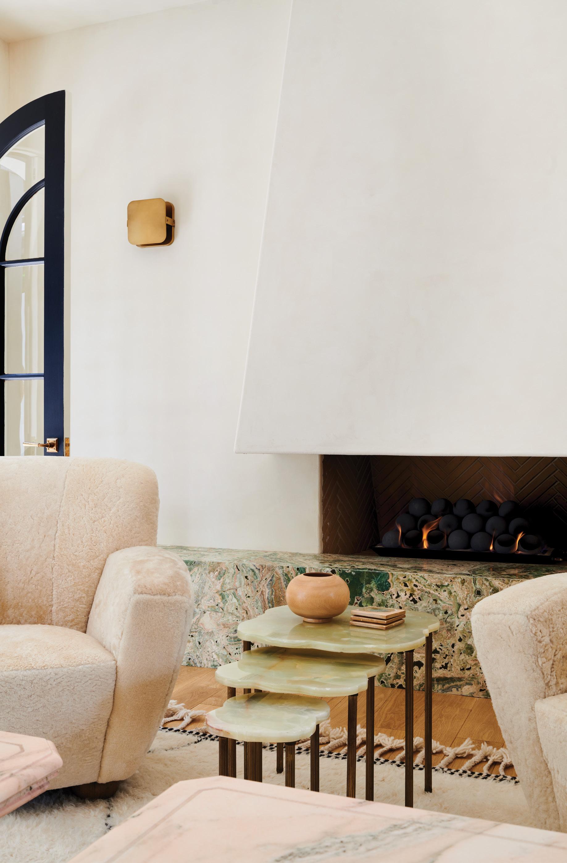 Other jaw-dropping spaces include the hotelinspired primary bedroom with a Cloud bed by RH and Mercury sconces in white onyx by Arteriors, and the sitting room with a fireplace bench wrapped in Esmeralda onyx, a pair of vintage pink marble tables, a modular sofa by Sarah Ellison and a Kelly chandelier by Gabriel Scott from Twentieth.