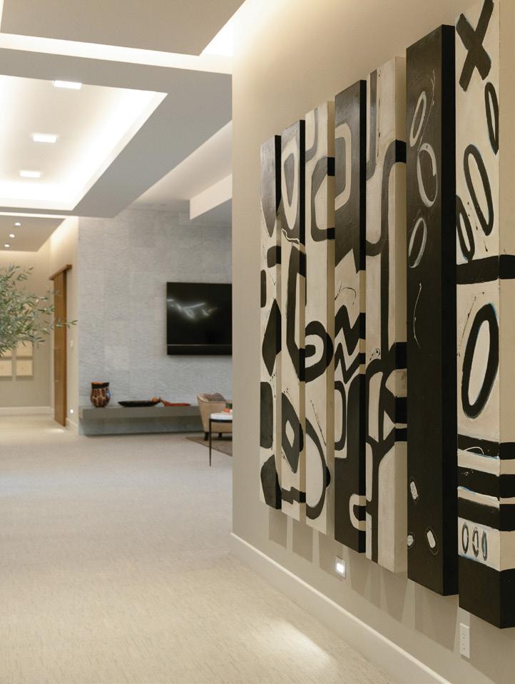We had the pleasure of completing another custom home in collaboration with local archi tect Doug Leach. C&C Partners constructed this 4,800-square-foot Coastal Transitional home, conceived around the idea of relaxed entertain ing for the whole family. The clients wanted an open feeling with lots of space, including four bedrooms, five baths and a billiard room large enough for entertaining while showcasing their extensive sports memorabilia collection. The color palette is simple, with most of the rooms framed in light-colored walls with coffered ceil ings, while dark wood floors throughout add warmth and contrast.