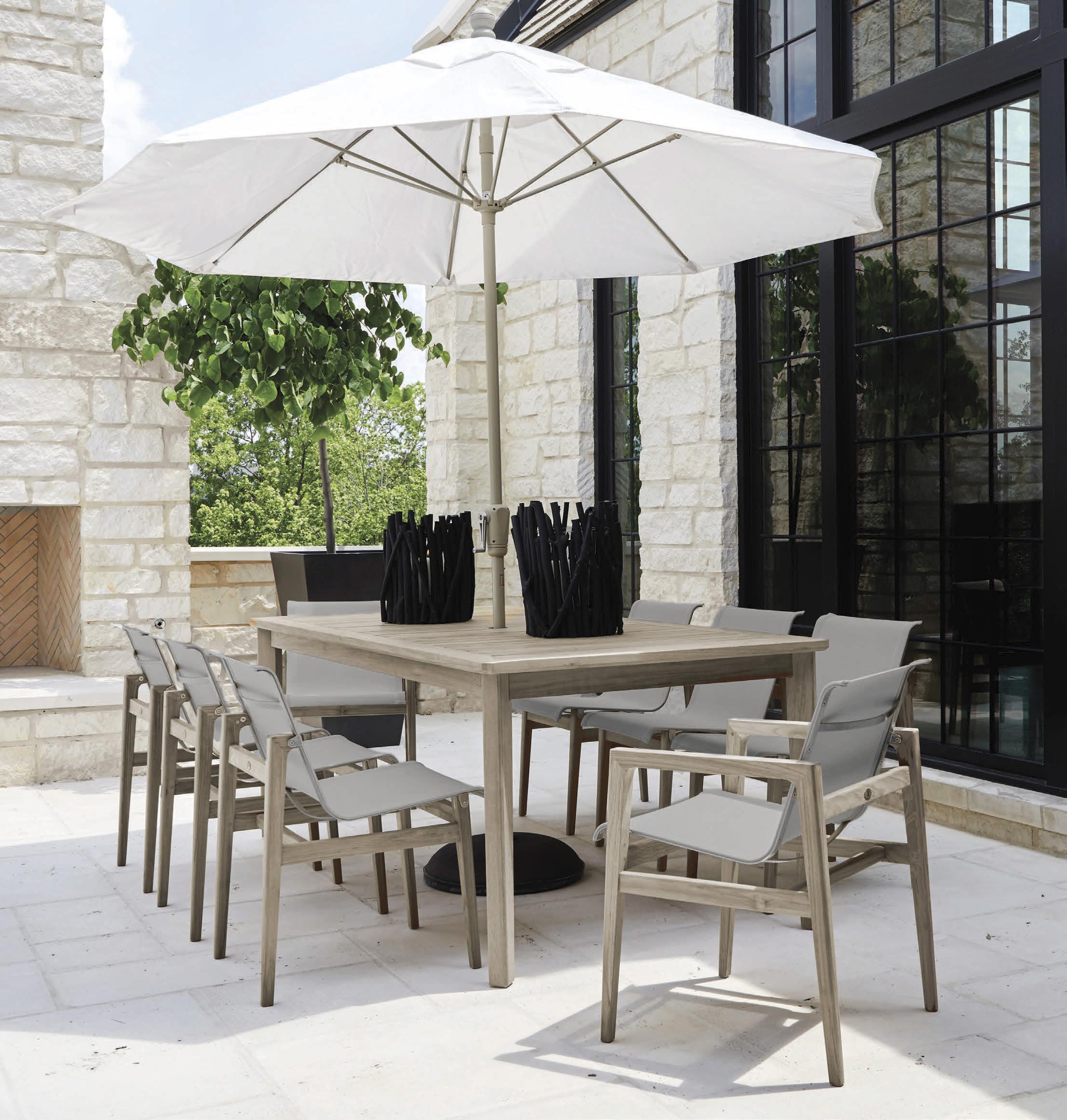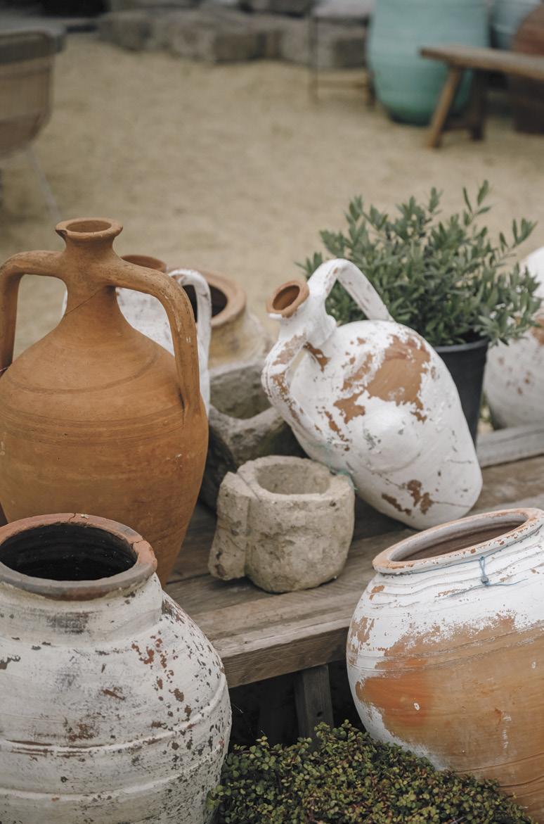 Sleek teak furniture—some pieces with contemporary lines—and crisp white umbrellas fill the outdoor space, along with a large assortment of aged pots of all colors (priced from $150 to $650). Inside the store, which visitors enter from a fully retractable sliding door, a charming assortment of accessories ranges from antique breadboards to handsome marble bowls to distressed wooden tables, stools and mirrors.