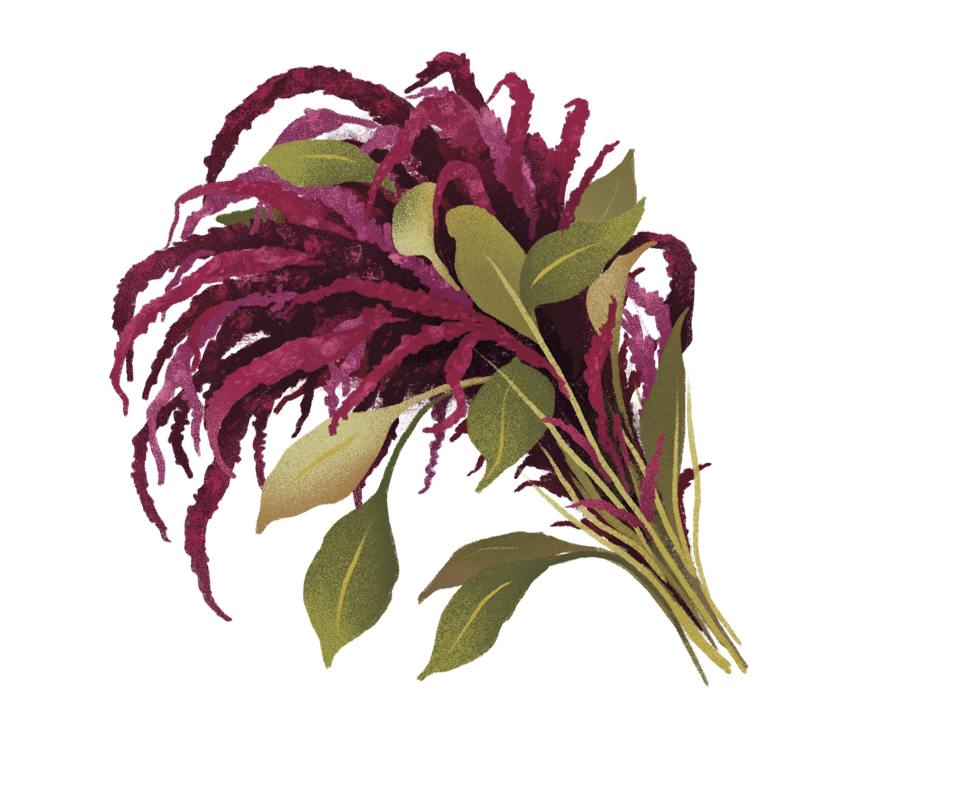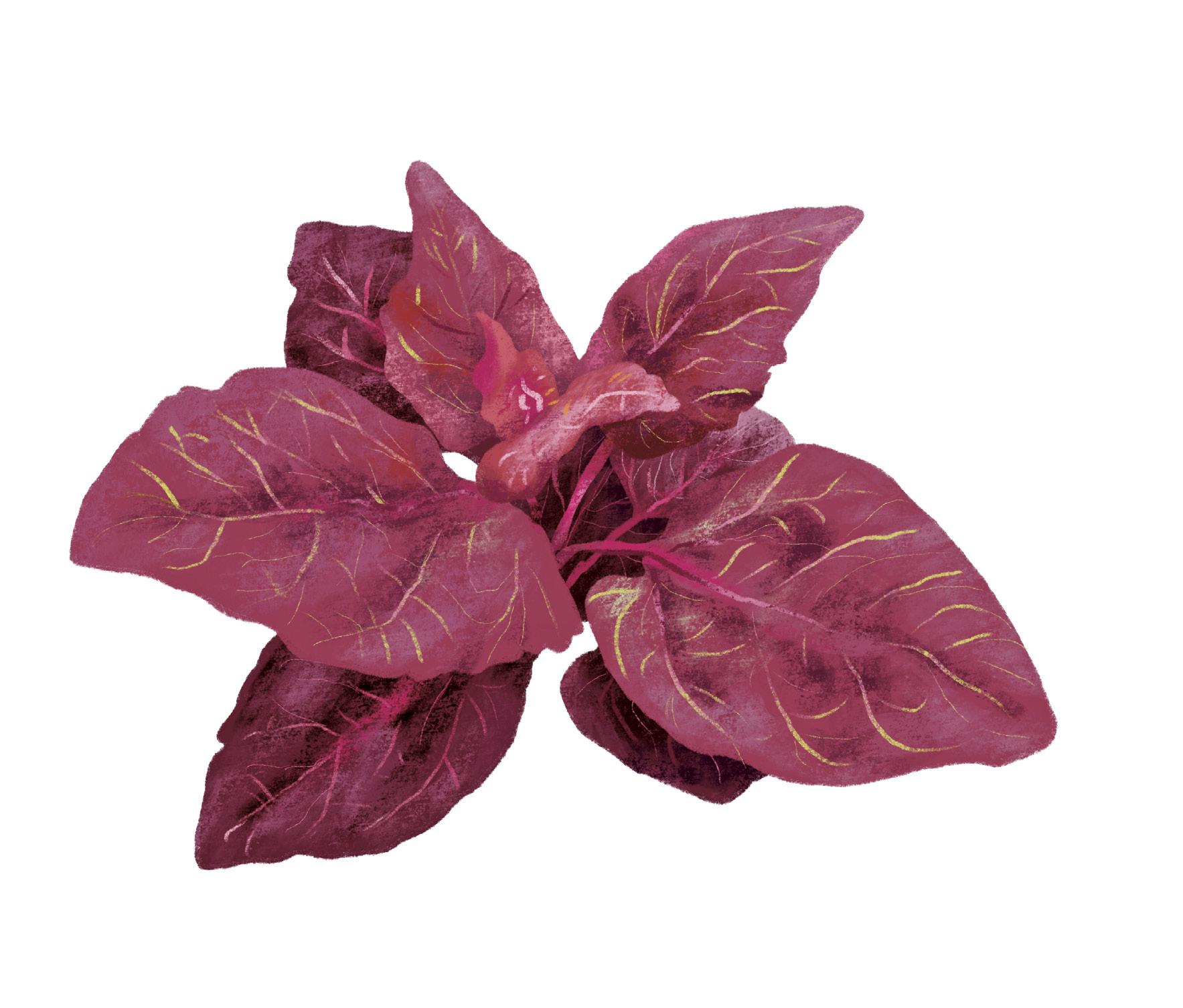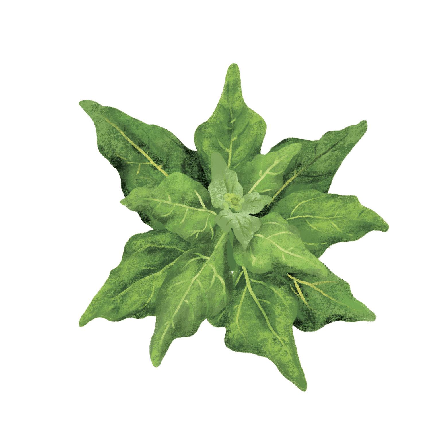 RED AZTEC SPINACH has tender leaves and stems that offer a rich spinach flavor, enhancing raw and cooked dishes. The seed heads are strik ing—they resemble miniature broccoli florets, offering a delightful crunch and mild flavor comparable to broccoli rabe.
