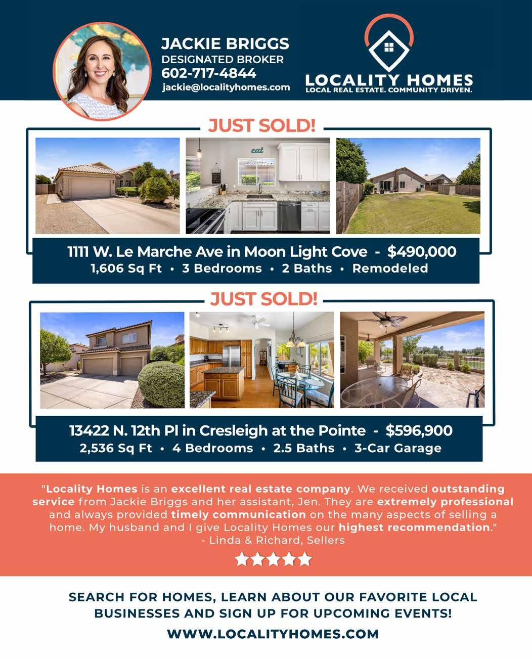 The Moon Valley Tattler | October 2022 7Call us: 602.765.0902 US!call JANELLE CASKIE SALES ASSOCIATE AZ 602.689.9899 JANELLECASKIE.COM CHERIE MALKOFF ASSOCIATE BROKER AZ SALES ASSOCIATE CA 602.677.8973 CHERIESELLSREALESTATE.COM 1002 W KELTON LANE PHOENIX, AZ 85023 4 BEDS | 2.5 BATHS | 2,330 SQFT NEW ROOF (2021) & NEW AC (2022) WITH WARRANTIES! $599,000 16137 W QUAIL CREEK LANE SURPRISE, AZ 85374 2 BEDS | 2 BATHS | 1,239 SQFT SUN CITY GRAND, LARGE & PRIVATE BACKYARD $370,000 117 E CARIBBEAN LANE PHOENIX, AZ 85023 4 BEDS | 3 BATHS | 2,900 SQFT $899,900 1105 WEST BETTY ELYSE LANE PHOENIX, AZ 85023 4 BEDS | 2.5 BATHS | 2 CAR GARAGE | 2,241 SQFT ON LARGE CORNER LOT, MANY FABULOUS UPDATES THROUGHOUT, MOONLIGHT COVE $599,900 COMING SOON! CHERIE’S PROPERTIES JANELLE’S PROPERTIES SOLD!