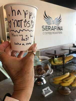 and the MV Women’s Club, giving back to the community. They barely opened!?! I spoke to the owner, Damian, about it and he said, “Why not? My wife is from MV.” Annnnd not only do they support other business es and our local high school, but their little cup with kind words to lift a sad spirit is supporting people on a personal level and it makes my heart happy.