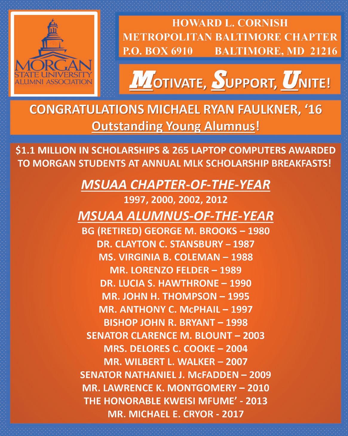 Howard L. Cornish Alumni ChapterMr. Faulkner is a 2016 graduate of Morgan State University with a Bachelor of Science Degree in Industrial and Systems Engineering. He is being recognized as the Outstanding Young Alumnus because of his exceptional undergraduate achievement, commitment to the MSU Alumni Association through his Life Membership (joined in May 2016), by joining the Howard L. Cornish Alumni Chapter and, purchasing sponsorships for the annual Martin Luther King, Jr. Scholarship Breakfast that make it possible for 2 Morgan students to attend. Since graduating from Morgan in June 2016, Michael has been employed as a Software Engineer at JP Morgan Chase and is currently a Software Engineer at LinkedIn in Houston, Texas. He uses technology to develop applications to solve some of the firms’ operational objectives and deliver key results. With diversity and inclusion being a topic of great discussion, he has the ongoing privilege of volunteering to recruit and interview top talent at various conferences, including the Black Engineer of the Year Award (BEYA), and serves as a mentor to new hires from various universities. Michael also served as a member of the National Society of Black Engineers (NSBE) Houston Professional Chapter.