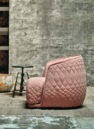Bouquet è una poltrona imbottita di elegante concezione, un tributo alla bellezza che, nella semplicità del gesto ripetuto, sfiora la dimensione spirituale. L’abito, composto da quadrati di tessuto piegati manualmente e cuciti uno ad uno con sapiente cura e infinita pazienza, avvolge la seduta fino a ricoprirla interamente di soffici petali. Allegoria del sogno, raffinata trasposizione poetica celebrata nella materialità insita nell’oggetto industriale, la poltrona rende felice colui che vi si siede, così come un bouquet di fiori gratifica chi lo riceve.