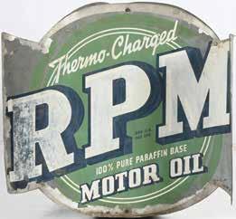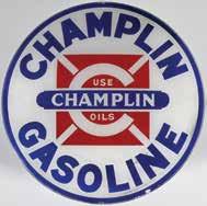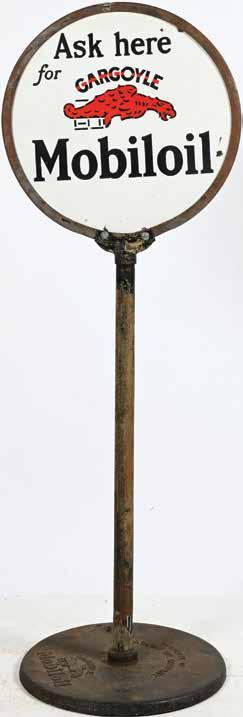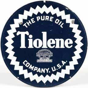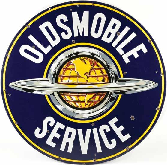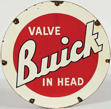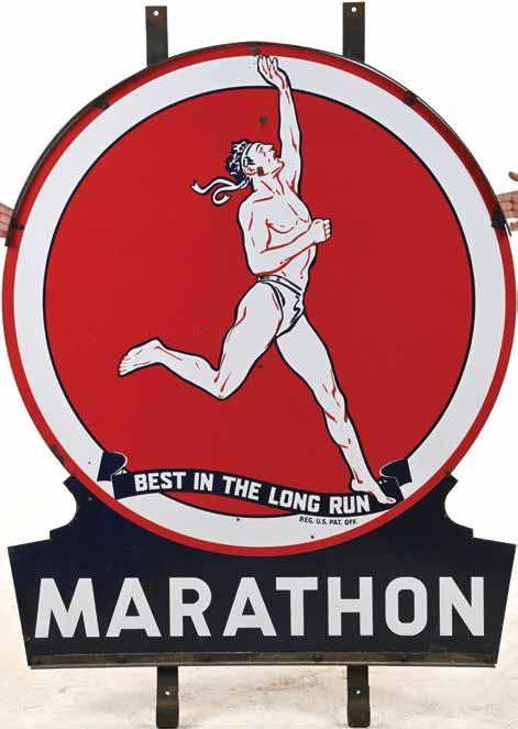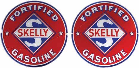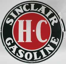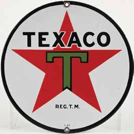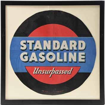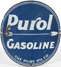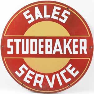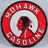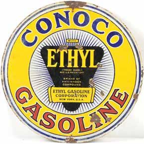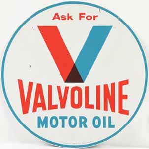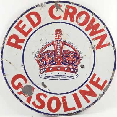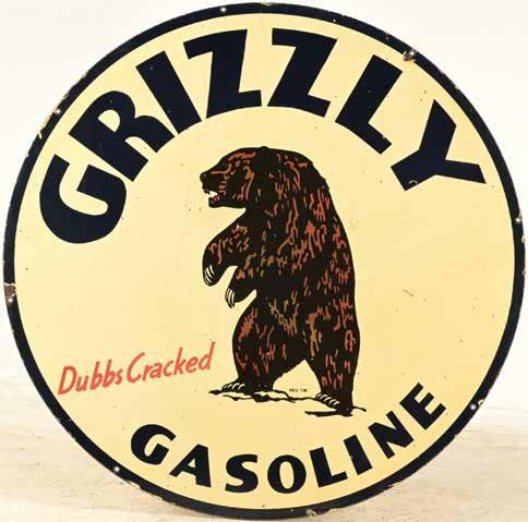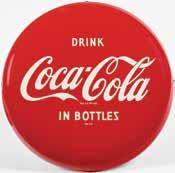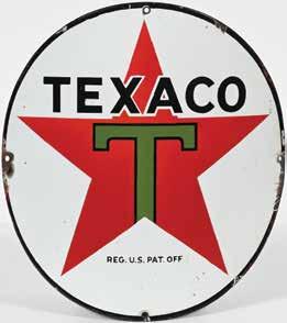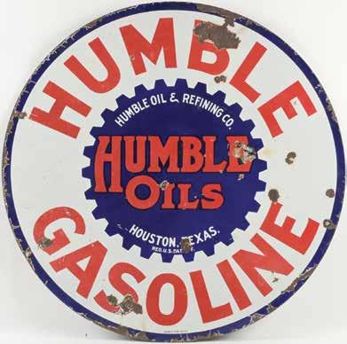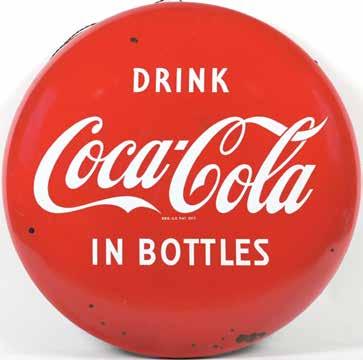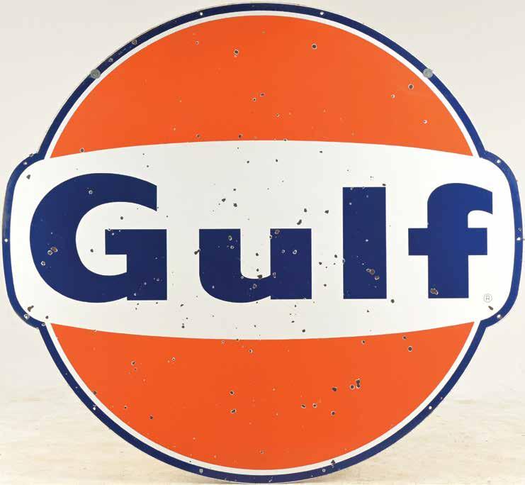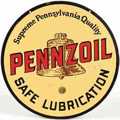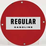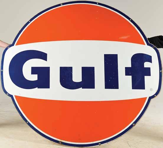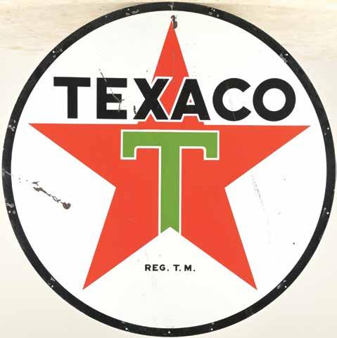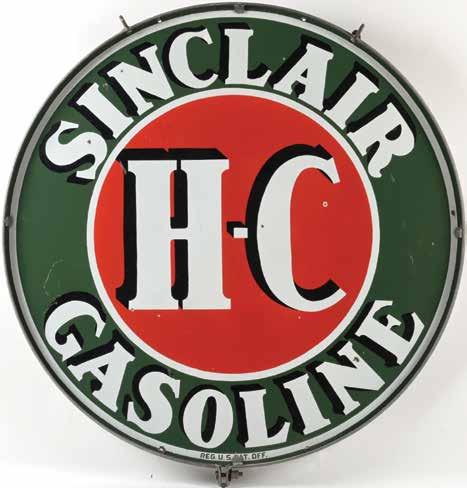 72” diam. DSP. C. 1950s. CONDITION: Sign shows excellent color and gloss throughout each side with moderate areas of light chipping, mostly in the outer field. Sign shows chipping at the mounting holes and along the black bordered outer edge. Overall displays well. This is not a standard shippable item and will require 3rd party shipping or pickup arrangements to be made. (8.0). 1,500 - 3,000